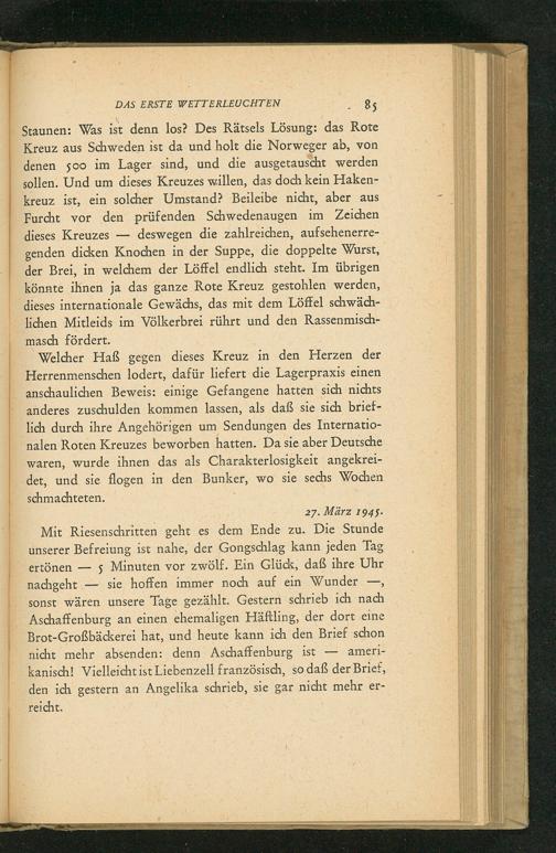 Staunen: Was ist denn los? Des Rätsels Lösung: das Rote Kreuz aus Schweden ist da und holt die Norweger ab, von denen 500 im Lager sind, und die ausgetauscht werden sollen. Und um dieses Kreuzes willen, das doch kein Hakenkreuz ist, ein solcher Umstand? Beileibe nicht, aber aus Furcht vor den prüfenden Schwedenaugen im Zeichen dieses Kreuzes deswegen die zahlreichen, aufsehenerregenden dicken Knochen in der Suppe, die doppelte Wurst, der Brei, in welchem der Löffel endlich steht. Im übrigen könnte ihnen ja das ganze Rote Kreuz gestohlen werden, dieses internationale Gewächs, das mit dem Löffel schwächlichen Mitleids im Völkerbrei rührt und den Rassenmischmasch fördert.