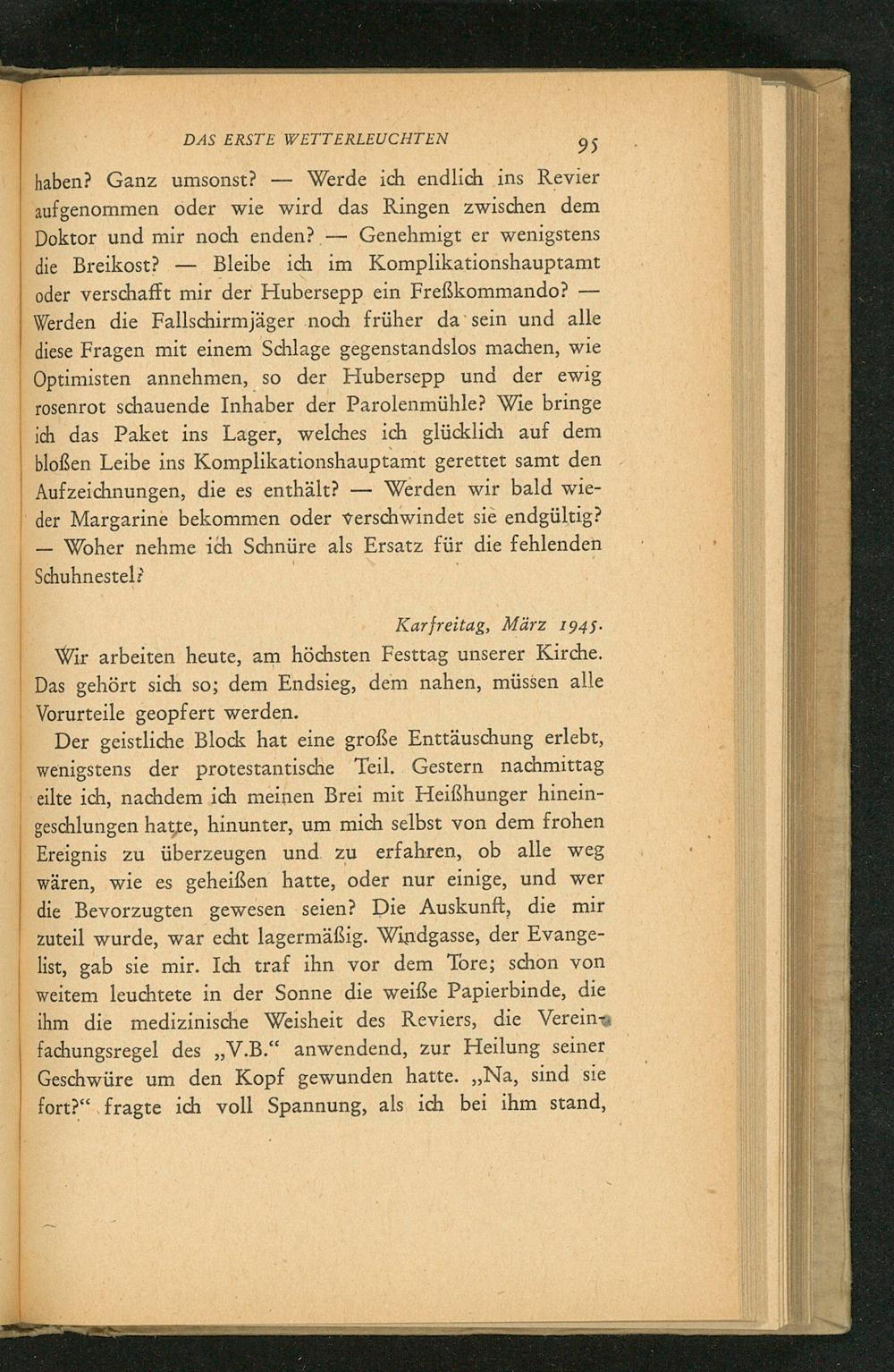 die Breikost? Bleibe ich im Komplikationshauptamt oder verschafft mir der Hubersepp ein Freßkommando? Werden die Fallschirmjäger noch früher da sein und alle diese Fragen mit einem Schlage gegenstandslos machen, wie Optimisten annehmen, so der Hubersepp und der ewig rosenrot schauende Inhaber der Parolenmühle? Wie bringe ich das Paket ins Lager, welches ich glücklich auf dem bloßen Leibe ins Komplikationshauptamt gerettet samt den Aufzeichnungen, die es enthält? Werden wir bald wieder Margarine bekommen oder verschwindet sie endgültig? Woher nehme ich Schnüre als Ersatz für die fehlenden Schuhnestel?