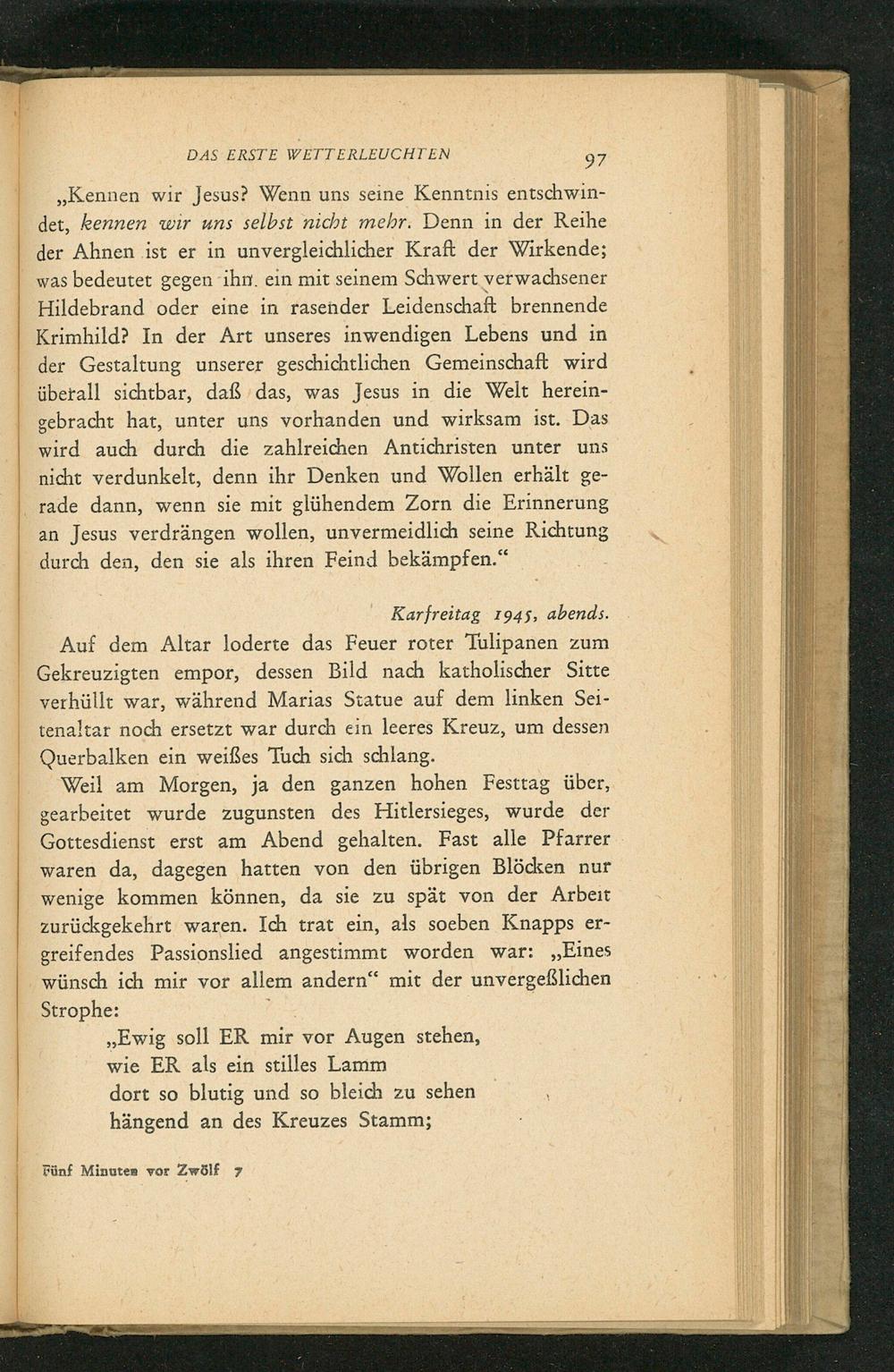 ,, Kennen wir Jesus ? Wenn uns seine Kenntnis entschwindet, kennen wir uns selbst nicht mehr. Denn in der Reihe der Ahnen ist er in unvergleichlicher Kraft der Wirkende; was bedeutet gegen ihn. ein mit seinem Schwert verwachsener Hildebrand oder eine in rasender Leidenschaft brennende Krimhild? In der Art unseres inwendigen Lebens und in der Gestaltung unserer geschichtlichen Gemeinschaft wird überall sichtbar, daß das, was Jesus in die Welt hereingebracht hat, unter uns vorhanden und wirksam ist. Das wird auch durch die zahlreichen Antichristen unter uns nicht verdunkelt, denn ihr Denken und Wollen erhält gerade dann, wenn sie mit glühendem Zorn die Erinnerung an Jesus verdrängen wollen, unvermeidlich seine Richtung durch den, den sie als ihren Feind bekämpfen."