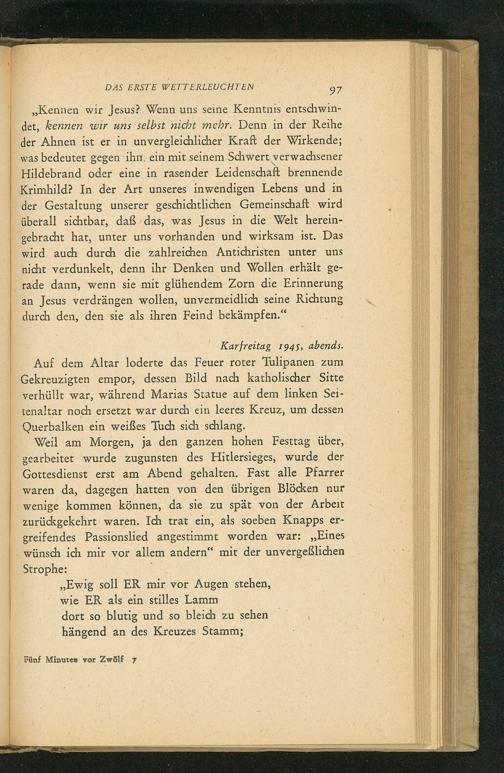 Weil am Morgen, ja den ganzen hohen Festtag über, gearbeitet wurde zugunsten des Hitlersieges, wurde der Gottesdienst erst am Abend gehalten. Fast alle Pfarrer waren da, dagegen hatten von den übrigen Blöcken nur wenige kommen können, da sie zu spät von der Arbeit zurückgekehrt waren. Ich trat ein, als soeben Knapps ergreifendes Passionslied angestimmt worden war: ,, Eines wünsch ich mir vor allem andern" mit der unvergeßlichen Strophe: