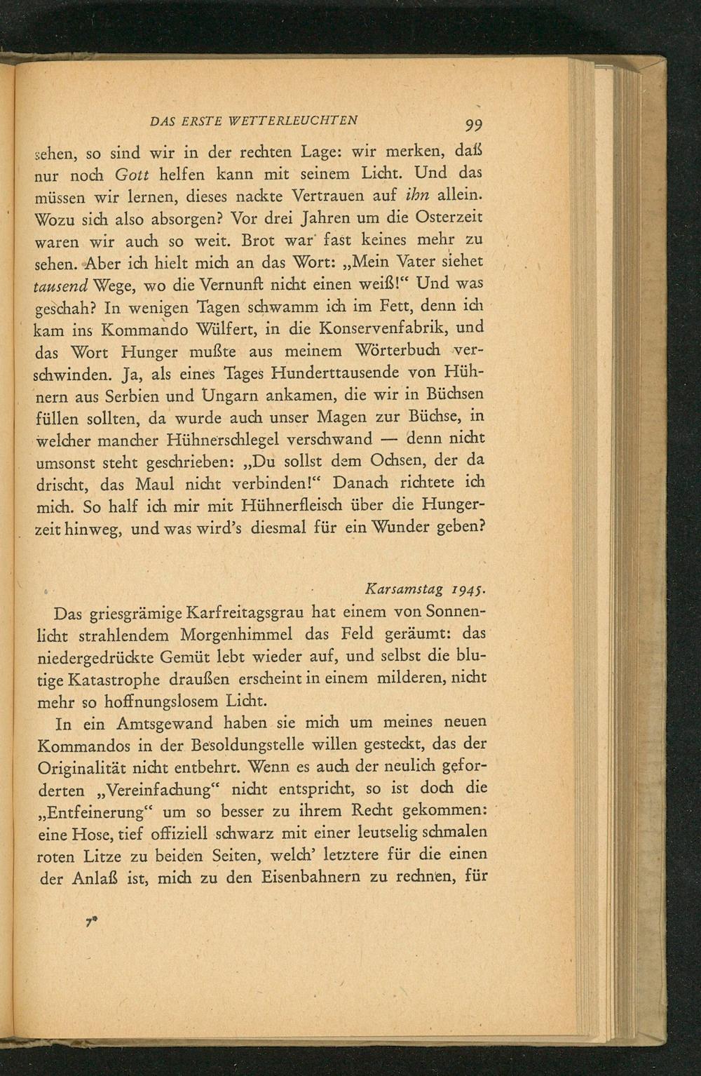 sehen, so sind wir in der rechten Lage: wir merken, daß nur noch Gott helfen kann mit seinem Licht. Und das müssen wir lernen, dieses nackte Vertrauen auf ihn allein. Wozu sich also absorgen? Vor drei Jahren um die Osterzeit waren wir auch so weit. Brot war fast keines mehr zu sehen. Aber ich hielt mich an das Wort: ,, Mein Vater siehet tausend Wege, wo die Vernunft nicht einen weiß!" Und was geschah? In wenigen Tagen schwamm ich im Fett, denn ich kam ins Kommando Wülfert, in die Konservenfabrik, und das Wort Hunger mußte aus meinem Wörterbuch verschwinden. Ja, als eines Tages Hunderttausende von Hühnern aus Serbien und Ungarn ankamen, die wir in Büchsen füllen sollten, da wurde auch unser Magen zur Büchse, in welcher mancher Hühnerschlegel verschwand- denn nicht umsonst steht geschrieben: ,, Du sollst dem Ochsen, der da drischt, das Maul nicht verbinden!" Danach richtete ich mich. So half ich mir mit Hühnerfleisch über die Hungerzeit hinweg, und was wird's diesmal für ein Wunder geben?