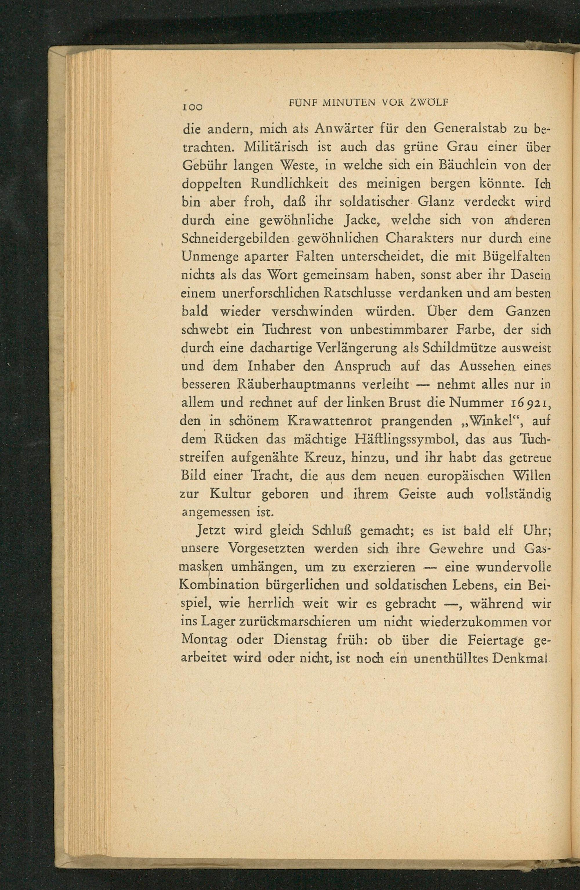 Jetzt wird gleich Schluß gemacht; es ist bald elf Uhr; unsere Vorgesetzten werden sich ihre Gewehre und Gasmasken umhängen, um zu exerzieren eine wundervolle Kombination bürgerlichen und soldatischen Lebens, ein Beispiel, wie herrlich weit wir es gebracht, während wir ins Lager zurückmarschieren um nicht wiederzukommen vor Montag oder Dienstag früh: ob über die Feiertage gearbeitet wird oder nicht, ist noch ein unenthülltes Denkmal