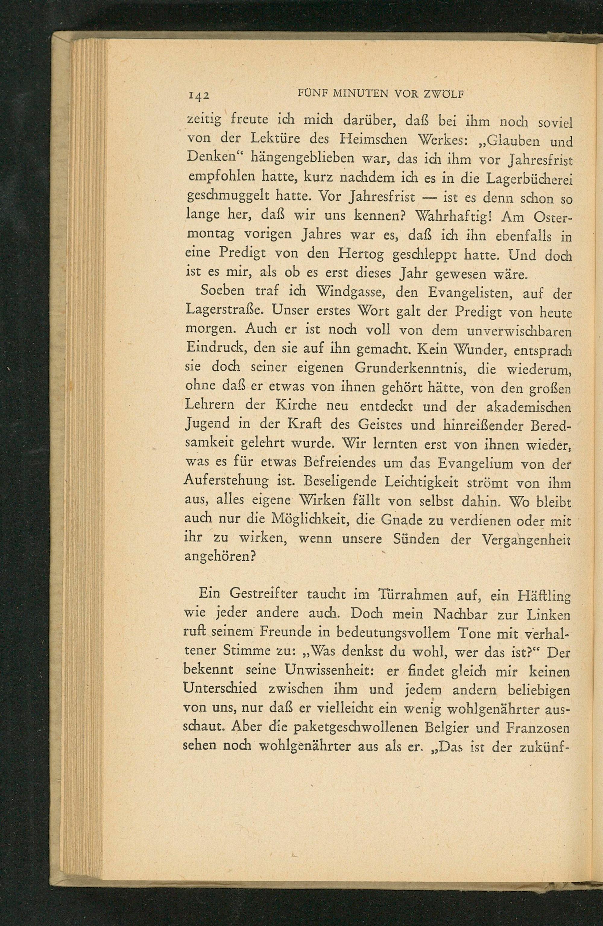 zeitig freute ich mich darüber, daß bei ihm noch soviel von der Lektüre des Heimschen Werkes:„Glauben und Denken“ hängengeblieben war, das ich ihm vor Jahresfrist empfohlen hatte, kurz nachdem ich es in die Lagerbücherei geschmuggelt hatte. Vor Jahresfrist— ist es denn schon so lange her, daß wir uns kennen? Wahrhaftig! Am Oster- montag vorigen Jahres war es, daß ich ihn ebenfalls in eine Predigt von den Hertog geschleppt hatte. Und doch ist es mir, als ob es erst dieses Jahr gewesen wäre.