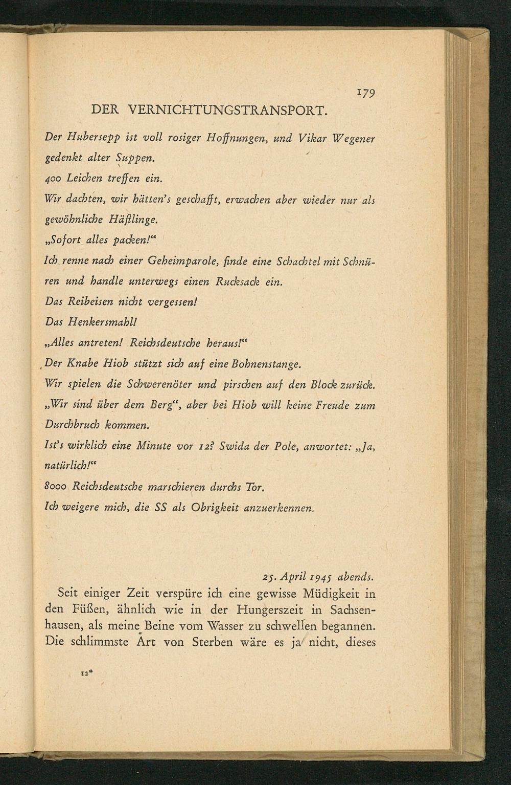 Seit einiger Zeit verspüre ich eine gewisse Müdigkeit in den Füßen, ähnlich wie in der Hungerszeit in Sachsenhausen, als meine Beine vom Wasser zu schwellen begannen. Die schlimmste Art von Sterben wäre es ja nicht, dieses