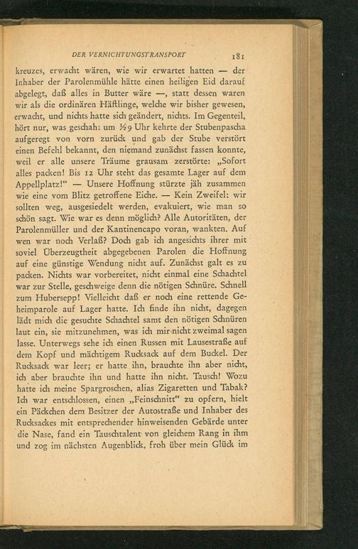 kreuzes, erwacht wären, wie wir erwartet hatten Inhaber der Parolenmühle hätte einen heiligen Eid darauf abgelegt, daß alles in Butter wäre statt dessen waren wir als die ordinären Häftlinge, welche wir bisher gewesen, erwacht, und nichts hatte sich geändert, nichts. Im Gegenteil, hört nur, was geschah: um 19 Uhr kehrte der Stubenpascha aufgeregt von vorn zurück und gab der Stube verstört einen Befehl bekannt, den niemand zunächst fassen konnte, weil er alle unsere Träume grausam zerstörte:„ Sofort alles packen! Bis 12 Uhr steht das gesamte Lager auf dem Appellplatz!" Unsere Hoffnung stürzte jäh zusammen wie eine vom Blitz getroffene Eiche. Kein Zweifel: wir sollten weg, ausgesiedelt werden, evakuiert, wie man so schön sagt. Wie war es denn möglich? Alle Autoritäten, der Parolenmüller und der Kantinencapo voran, wankten. Auf wen war noch Verlaß? Doch gab ich angesichts ihrer mit soviel Überzeugtheit abgegebenen Parolen die Hoffnung auf eine günstige Wendung nicht auf. Zunächst galt es zu packen. Nichts war vorbereitet, nicht einmal eine Schachtel war zur Stelle, geschweige denn die nötigen Schnüre. Schnell zum Hubersepp! Vielleicht daß er noch eine rettende Geheimparole auf Lager hatte. Ich finde ihn nicht, dagegen lädt mich die gesuchte Schachtel samt den nötigen Schnüren laut ein, sie mitzunehmen, was ich mir nicht zweimal sagen lasse. Unterwegs sehe ich einen Russen mit Lausestraße auf dem Kopf und mächtigem Rucksack auf dem Buckel. Der Rucksack war leer; er hatte ihn, brauchte ihn aber nicht, ich aber brauchte ihn und hatte ihn nicht. Tausch! Wozu hatte ich meine Spargroschen, alias Zigaretten und Tabak? Ich war entschlossen, einen ,, Feinschnitt" zu opfern, hielt ein Päckchen dem Besitzer der Autostraße und Inhaber des Rucksackes mit entsprechender hinweisenden Gebärde unter die Nase, fand ein Tauschtalent von gleichem Rang in ihm und zog im nächsten Augenblick, froh über mein Glück im