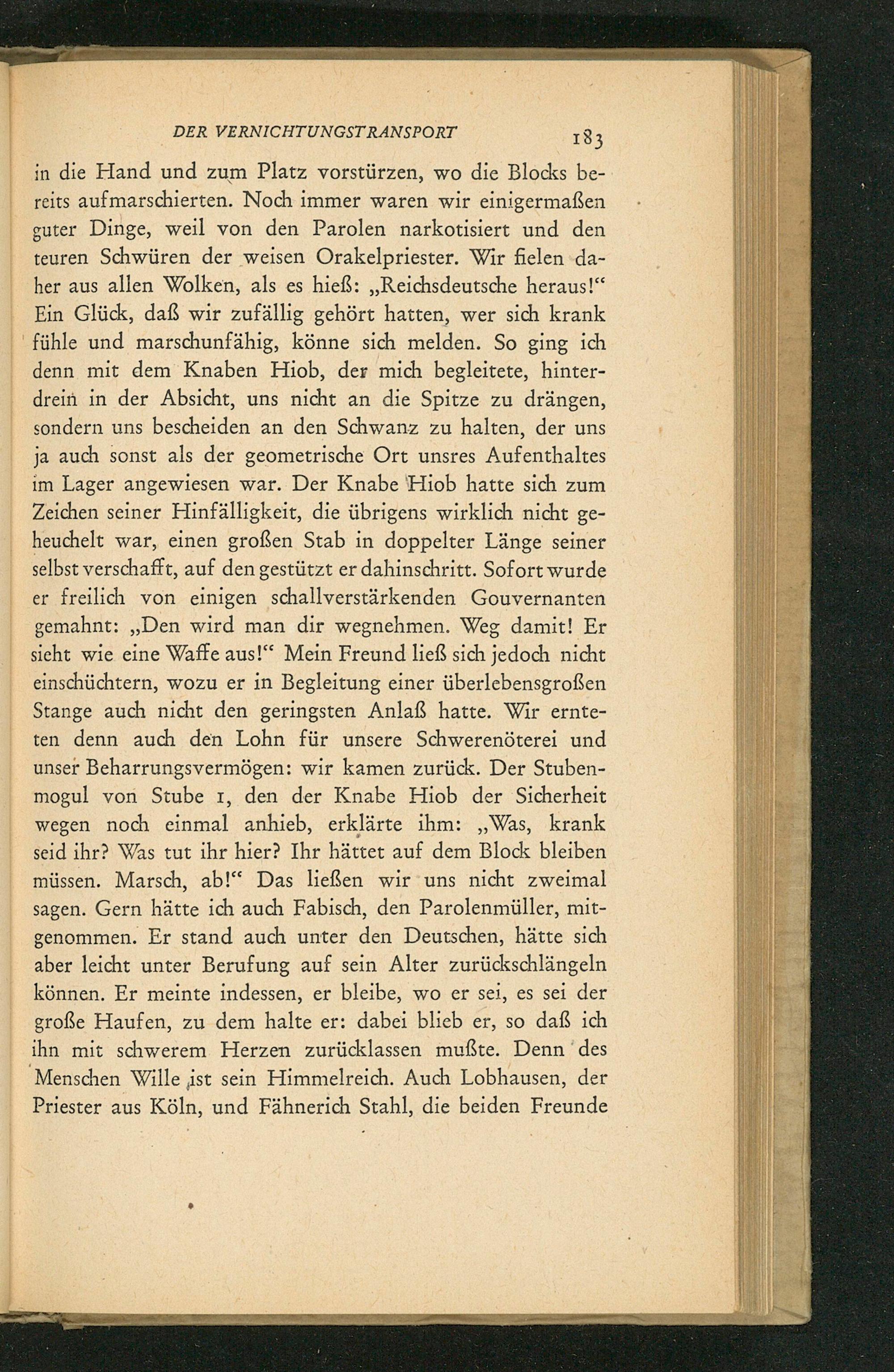 in die Hand und zum Platz vorstürzen, wo die Blocks bereits aufmarschierten. Noch immer waren wir einigermaßen guter Dinge, weil von den Parolen narkotisiert und den teuren Schwüren der weisen Orakelpriester. Wir fielen daher aus allen Wolken, als es hieß: ,, Reichsdeutsche heraus!" Ein Glück, daß wir zufällig gehört hatten, wer sich krank fühle und marschunfähig, könne sich melden. So ging ich denn mit dem Knaben Hiob , der mich begleitete, hinterdrein in der Absicht, uns nicht an die Spitze zu drängen, sondern uns bescheiden an den Schwanz zu halten, der uns ja auch sonst als der geometrische Ort unsres Aufenthaltes im Lager angewiesen war. Der Knabe Hiob hatte sich zum Zeichen seiner Hinfälligkeit, die übrigens wirklich nicht geheuchelt war, einen großen Stab in doppelter Länge seiner selbst verschafft, auf den gestützt er dahinschritt. Sofort wurde er freilich von einigen schallverstärkenden Gouvernanten gemahnt: ,, Den wird man dir wegnehmen. Weg damit! Er sieht wie eine Waffe aus!" Mein Freund ließ sich jedoch nicht einschüchtern, wozu er in Begleitung einer überlebensgroßen Stange auch nicht den geringsten Anlaß hatte. Wir ernteten denn auch den Lohn für unsere Schwerenöterei und unser Beharrungsvermögen: wir kamen zurück. Der Stubenmogul von Stube 1, den der Knabe Hiob der Sicherheit wegen noch einmal anhieb, erklärte ihm: ,, Was, krank seid ihr? Was tut ihr hier? Ihr hättet auf dem Block bleiben müssen. Marsch, ab!" Das ließen wir uns nicht zweimal sagen. Gern hätte ich auch Fabisch, den Parolenmüller, mitgenommen. Er stand auch unter den Deutschen , hätte sich aber leicht unter Berufung auf sein Alter zurückschlängeln können. Er meinte indessen, er bleibe, wo er sei, es sei der große Haufen, zu dem halte er: dabei blieb er, so daß ich ihn mit schwerem Herzen zurücklassen mußte. Denn des Menschen Wille ist sein Himmelreich. Auch Lobhausen, der Priester aus Köln , und Fähnerich Stahl, die beiden Freunde