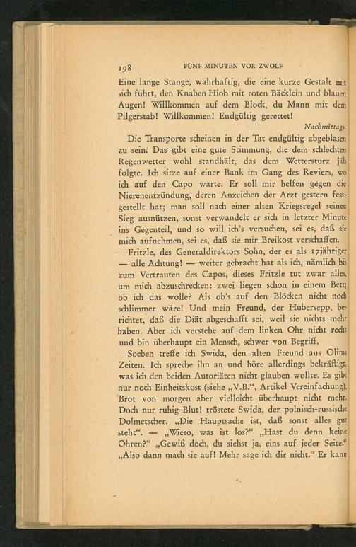 Die Transporte scheinen in der Tat endgültig abgeblasen zu sein. Das gibt eine gute Stimmung, die dem schlechten Regenwetter wohl standhält, das dem Wettersturz jäh folgte. Ich sitze auf einer Bank im Gang des Reviers, wo ich auf den Capo warte. Er soll mir helfen gegen die Nierenentzündung, deren Anzeichen der Arzt gestern festgestellt hat; man soll nach einer alten Kriegsregel seinen Sieg ausnützen, sonst verwandelt er sich in letzter Minute ins Gegenteil, und so will ich's versuchen, sei es, daß sie mich aufnehmen, sei es, daß sie mir Breikost verschaffen. Fritzle, des Generaldirektors Sohn, der es als 17jähriger alle Achtung! weiter gebracht hat als ich, nämlich bis zum Vertrauten des Capos, dieses Fritzle tut zwar alles, um mich abzuschrecken: zwei liegen schon in einem Bett; ob ich das wolle? Als ob's auf den Blöcken nicht noch schlimmer wäre! Und mein Freund, der Hubersepp, berichtet, daß die Diät abgeschafft sei, weil sie nichts mehr haben. Aber ich verstehe auf dem linken Ohr nicht recht und bin überhaupt ein Mensch, schwer von Begriff.