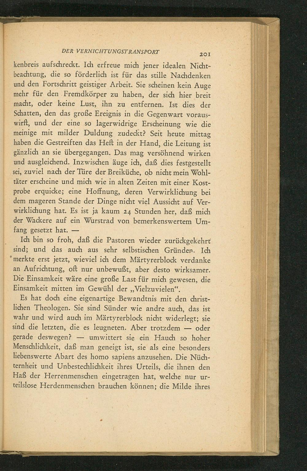 Es hat doch eine eigenartige Bewandtnis mit den christlichen Theologen. Sie sind Sünder wie andre auch, das ist wahr und wird auch im Märtyrerblock nicht widerlegt; sie sind die letzten, die es leugneten. Aber trotzdem oder gerade deswegen? umwittert sie ein Hauch so hoher Menschlichkeit, daß man geneigt ist, sie als eine besonders liebenswerte Abart des homo sapiens anzusehen. Die Nüchternheit und Unbestechlichkeit ihres Urteils, die ihnen den Haß der Herrenmenschen eingetragen hat, welche nur urteilslose Herdenmenschen brauchen können; die Milde ihres
