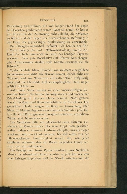 Vernichtung auszuführen, die von langer Hand her gegen die Deutschen geschmiedet waren. Gott sei Dank, Er hat es den Elementen der Zerstörung nicht erlaubt, die Schleusen zu öffnen und den Segen der bevorstehenden Befreiung in den Fluch der gegenseitigen Zerfleischung zu verwandeln. Die Übergabemannschaft befindet sich bereits am Tor, Mann stark( 2 SS- und 1 Wehrmachtsoldat), um die Ankunft des Uncle Sam noch im Laufe des heutigen Tages zu erwarten. ,, Sehr gute Botschaft"! ruft Pfarrer Kreuzberger; ,, der Arbeitseinsatz strahlt; jede Minute erwarten sie die Befreier".
