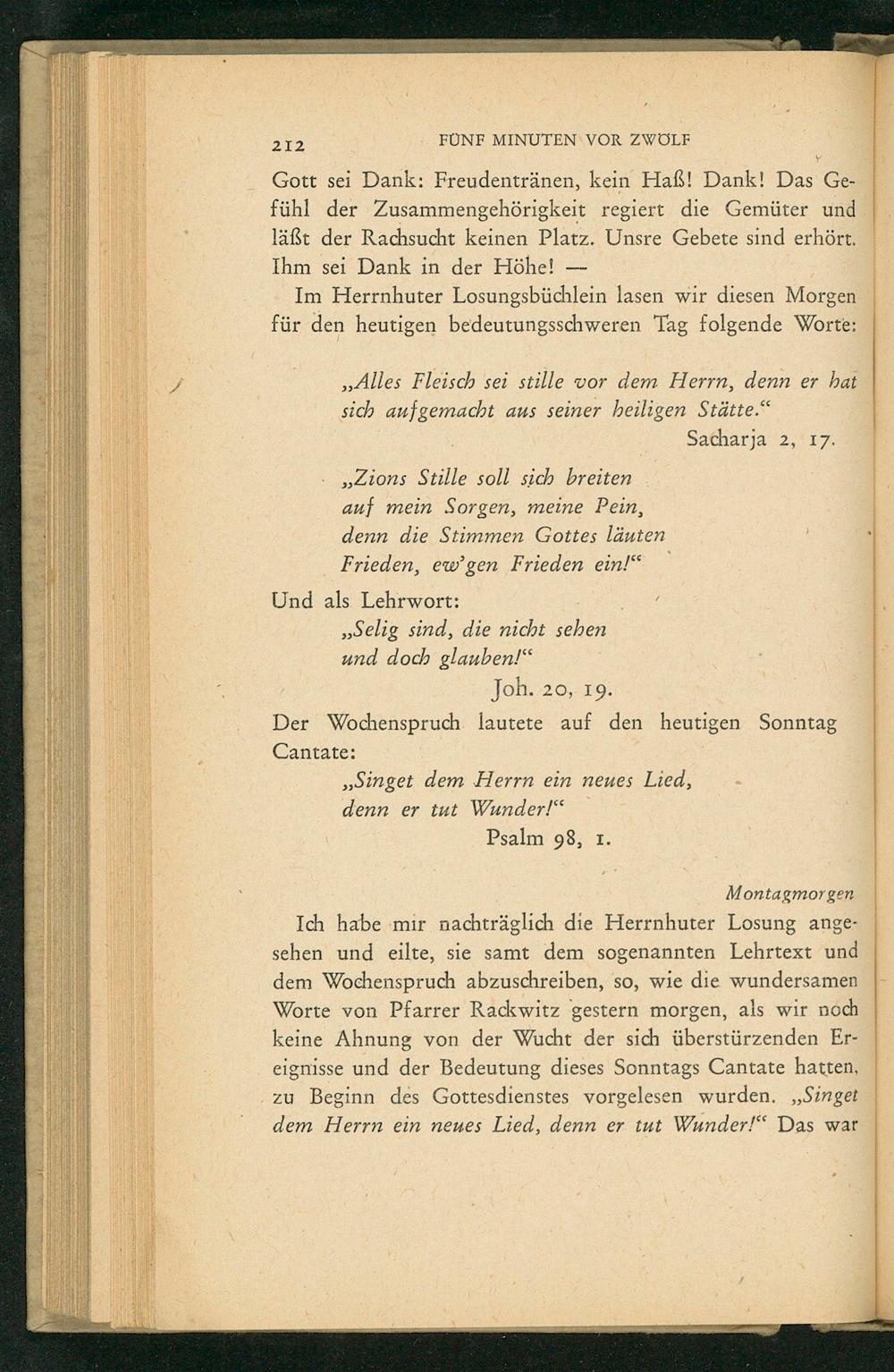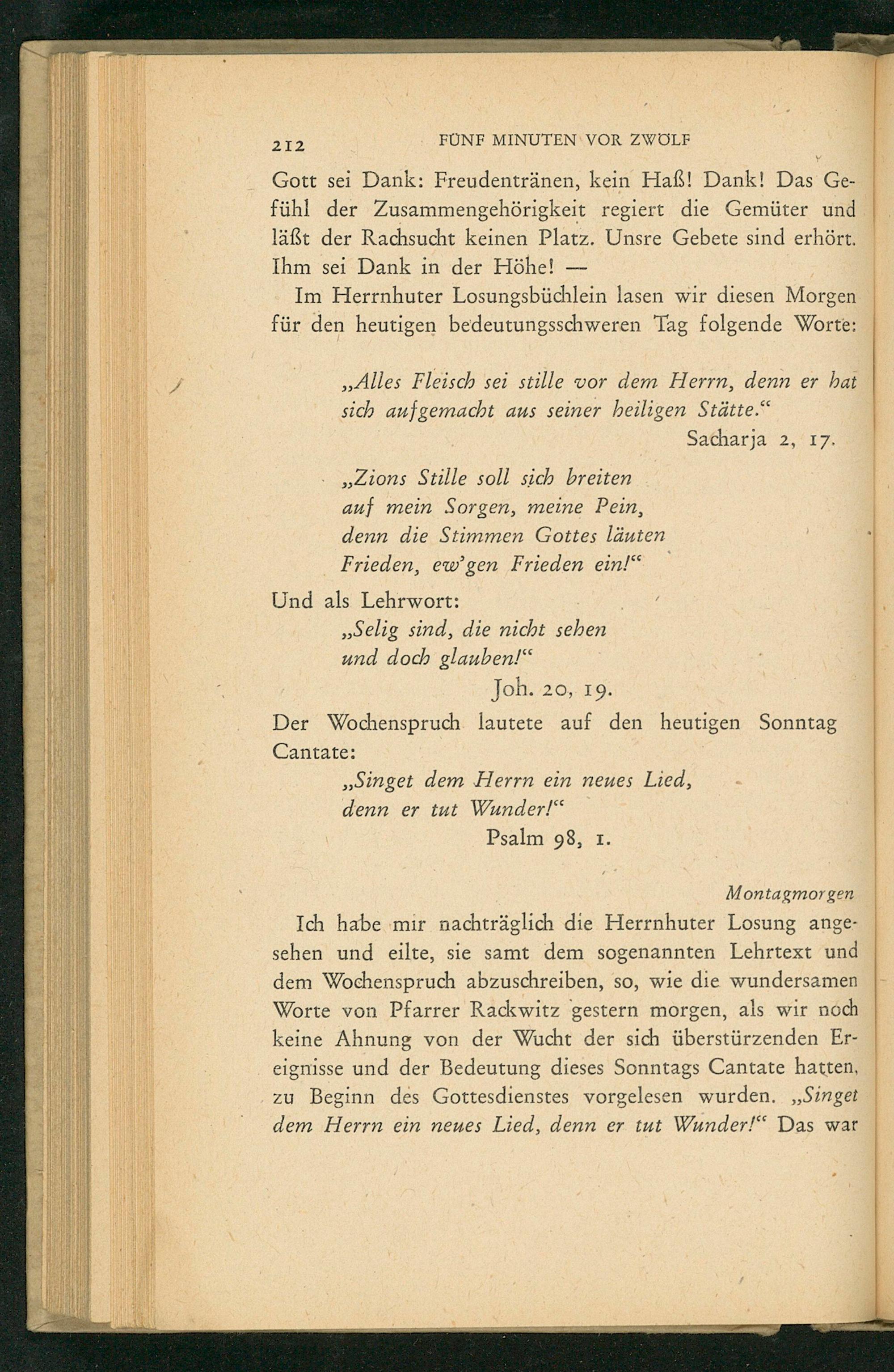 Ich habe mir nachträglich die Herrnhuter Losung angesehen und eilte, sie samt dem sogenannten Lehrtext und dem Wochenspruch abzuschreiben, so, wie die wundersamen Worte von Pfarrer Rackwitz gestern morgen, als wir noch keine Ahnung von der Wucht der sich überstürzenden Ereignisse und der Bedeutung dieses Sonntags Cantate hatten, zu Beginn des Gottesdienstes vorgelesen wurden. ,, Singet dem Herrn ein neues Lied, denn er tut Wunder!" Das war