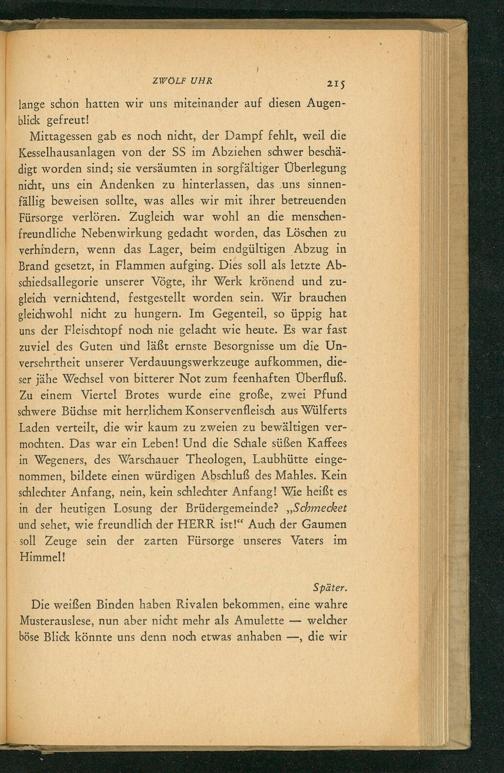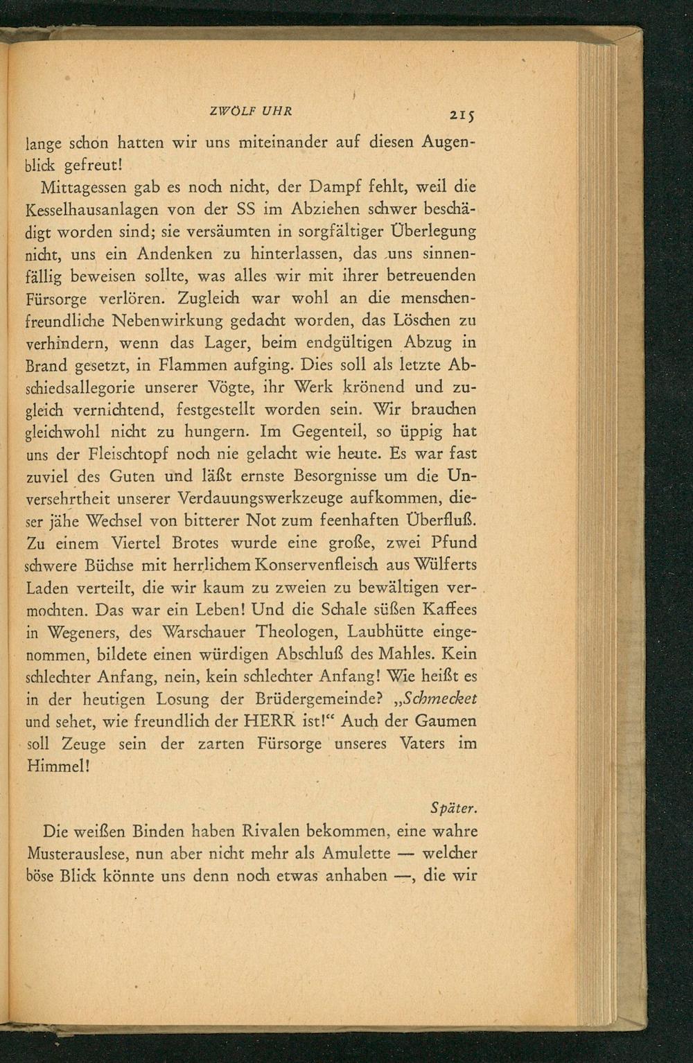 Mittagessen gab es noch nicht, der Dampf fehlt, weil die Kesselhausanlagen von der SS im Abziehen schwer beschädigt worden sind; sie versäumten in sorgfältiger Überlegung nicht, uns ein Andenken zu hinterlassen, das uns sinnenfällig beweisen sollte, was alles wir mit ihrer betreuenden Fürsorge verlören. Zugleich war wohl an die menschenfreundliche Nebenwirkung gedacht worden, das Löschen zu verhindern, wenn das Lager, beim endgültigen Abzug in Brand gesetzt, in Flammen aufging. Dies soll als letzte Abschiedsallegorie unserer Vögte, ihr Werk krönend und zugleich vernichtend, festgestellt worden sein. Wir brauchen gleichwohl nicht zu hungern. Im Gegenteil, so üppig hat uns der Fleischtopf noch nie gelacht wie heute. Es war fast zuviel des Guten und läßt ernste Besorgnisse um die Unversehrtheit unserer Verdauungswerkzeuge aufkommen, dieser jähe Wechsel von bitterer Not zum feenhaften Überfluß. Zu einem Viertel Brotes wurde eine große, zwei Pfund schwere Büchse mit herrlichem Konservenfleisch aus Wülferts Laden verteilt, die wir kaum zu zweien zu bewältigen vermochten. Das war ein Leben! Und die Schale süßen Kaffees in Wegeners, des Warschauer Theologen, Laubhütte eingenommen, bildete einen würdigen Abschluß des Mahles. Kein schlechter Anfang, nein, kein schlechter Anfang! Wie heißt es in der heutigen Losung der Brüdergemeinde? ,, Schmecket und sehet, wie freundlich der HERR ist!" Auch der Gaumen soll Zeuge sein der zarten Fürsorge unseres Vaters im Himmel!