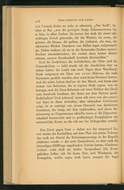 sein Freund, findet sie nicht so schwierig. ,, Der Stoff", belehrt er ihn ,,, war die geringste Sorge. Kilometerweise lag er hier, in allen Farben. Sie hatten ihn doch für einen sehr wichtigen Zweck gebraucht, für die Winkel; die roten, die grünen, die blauen, die gelben, die violetten, die rosa, die schwarzen Winkel. Hunderte von Ballen lagen aufgestapelt da. Nichts leichter, als sie in die flatternden Zeichen unserer Freiheit umzuschneidern, die vorher dazu hatten dienen müssen, unserer Knechtschaft Symbole darzustellen."