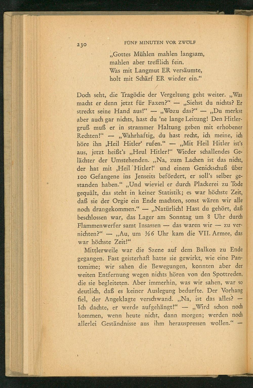 Doch seht, die Tragödie der Vergeltung geht weiter. ,, Was macht er denn jetzt für Faxen?"- ,, Siehst du nichts? Er streckt seine Hand aus!" Wozu das?" ,, Du merkst aber auch gar nichts, hast du' ne lange Leitung! Den Hitlergruß muß er in strammer Haltung geben mit erhobener Rechten!" Wahrhaftig, du hast recht, ich meine, ich höre ihn Heil Hitler' rufen."- ,, Mit Heil Hitler ist's ihn, Heil aus, jetzt heißt's ,, Heul Hitler!" Wieder schallendes Gelächter der Umstehenden. ,, Na, zum Lachen ist das nicht, der hat mit, Heil Hitler!' und einem Genickschuß über 100 Gefangene ins Jenseits befördert, er soll's selber gestanden haben." ,, Und wieviel er durch Plackerei zu Tode gequält, das steht in keiner Statistik; es war höchste Zeit, daß sie der Orgie ein Ende machten, sonst wären wir alle noch drangekommen."- ,, Natürlich! Hast du gehört, daß beschlossen war, das Lager am Sonntag um 8 Uhr durch Flammenwerfer samt Insassen das waren wir zu vernichten?" ,, Au, um 26 Uhr kam die VII. Armee, das war höchste Zeit!"