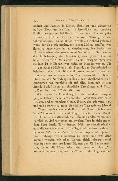 Säcken und Päcken, in Kisten, Tornistern und Schachteln auf den Block, um den Inhalt in Strohsäcken und sonstigen ähnlich geeigneten Behältern zu verstauen. Da ist jedes volkswirtschaftliche Gut vertreten vom Nähzeug bis zur Schreibmaschine. Es ist, als ob in viele ein Kobold gefahren wäre, der sie gierig machte, mit einem Mal zu erraffen, was ihnen so lange vorenthalten worden war, den Parias, den Untermenschen, den sogenannten Verbrechern. Nur, wo ist der Möbelwagen, der bereitsteht, den ganzen Hausrat hinauszuschaffen? Das Ganze ist eine Transportfrage; wer sie löst, ist Millionär, wer nicht, ist Museumswärter. Wir der Knabe Hiob und sein Freund, der Grobschmied behalten daher ruhig Blut und lassen uns nicht anwerben zum modernsten Kommando. Aber während der Knabe Hiob um des Nachschlags willen einen Schreiberdienst angenommen hat, verzichte ich auf alles, denn mir ist eine Stunde Schlaf lieber als sämtliche Ehrenämter und Nachschläge sämtlicher KZ der Welt.-