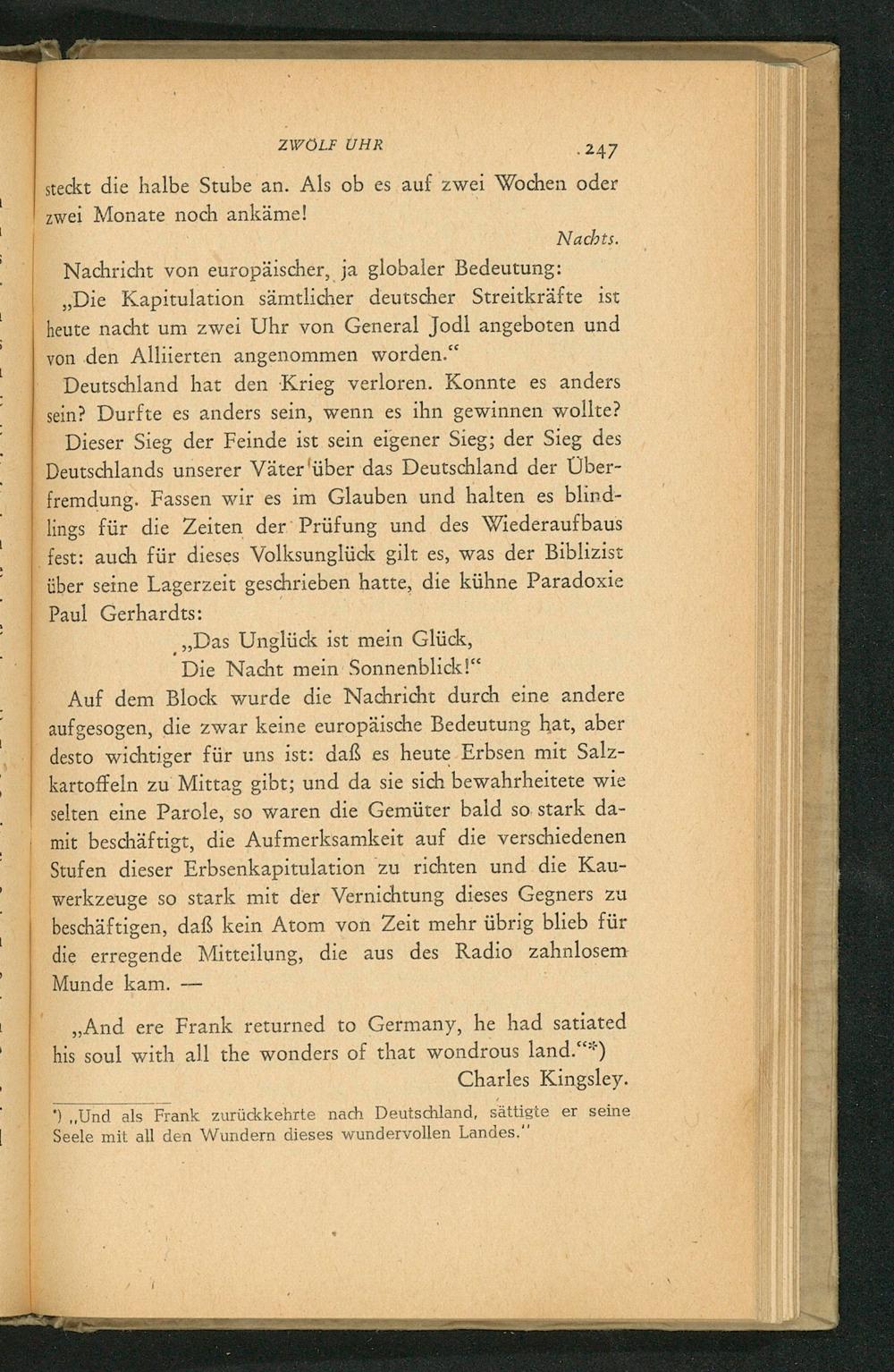 Dieser Sieg der Feinde ist sein eigener Sieg; der Sieg des Deutschlands unserer Väter'über das Deutschland der Über- fremdung. Fassen wir es im Glauben und halten es blind- lings für die Zeiten der’ Prüfung und des Wiederaufbaus | fest: auch für dieses Volksunglück gilt es, was der Biblizist _ über seine Lagerzeit geschrieben hatte, die kühne Paradoxie _ Paul Gerhardts: