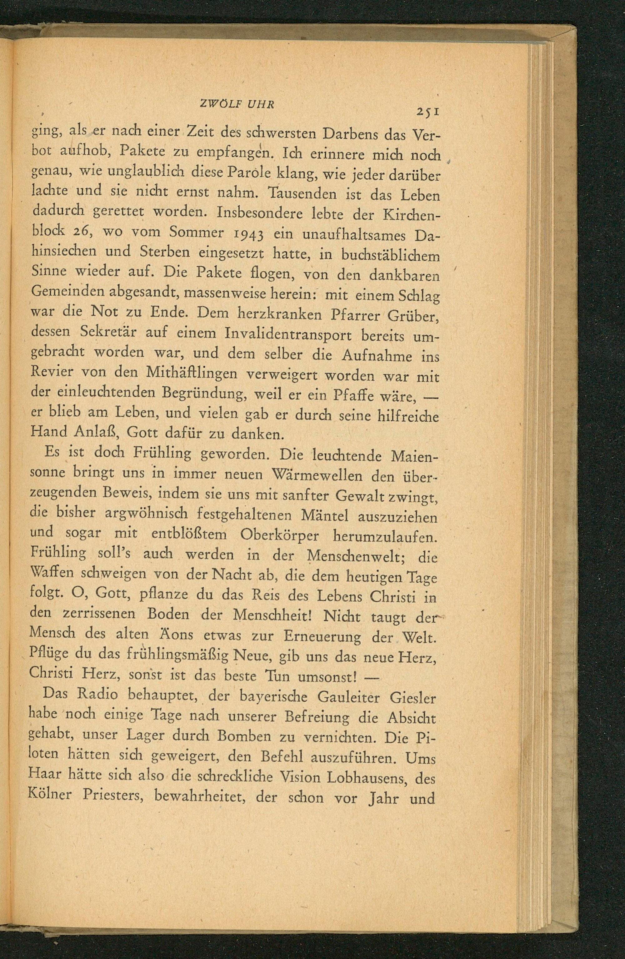 251 ging, als er nach einer Zeit des schwersten Darbens das Verbot aufhob, Pakete zu empfangen. Ich erinnere mich noch genau, wie unglaublich diese Parole klang, wie jeder darüber lachte und sie nicht ernst nahm. Tausenden ist das Leben dadurch gerettet worden. Insbesondere lebte der Kirchenblock 26, wo vom Sommer 1943 ein unaufhaltsames Dahinsiechen und Sterben eingesetzt hatte, in buchstäblichem Sinne wieder auf. Die Pakete flogen, von den dankbaren Gemeinden abgesandt, massenweise herein: mit einem Schlag war die Not zu Ende. Dem herzkranken Pfarrer Grüber, dessen Sekretär auf einem Invalidentransport bereits umgebracht worden war, und dem selber die Aufnahme ins Revier von den Mithäftlingen verweigert worden war mit der einleuchtenden Begründung, weil er ein Pfaffe wäre,- er blieb am Leben, und vielen gab er durch seine hilfreiche Hand Anlaß, Gott dafür zu danken.