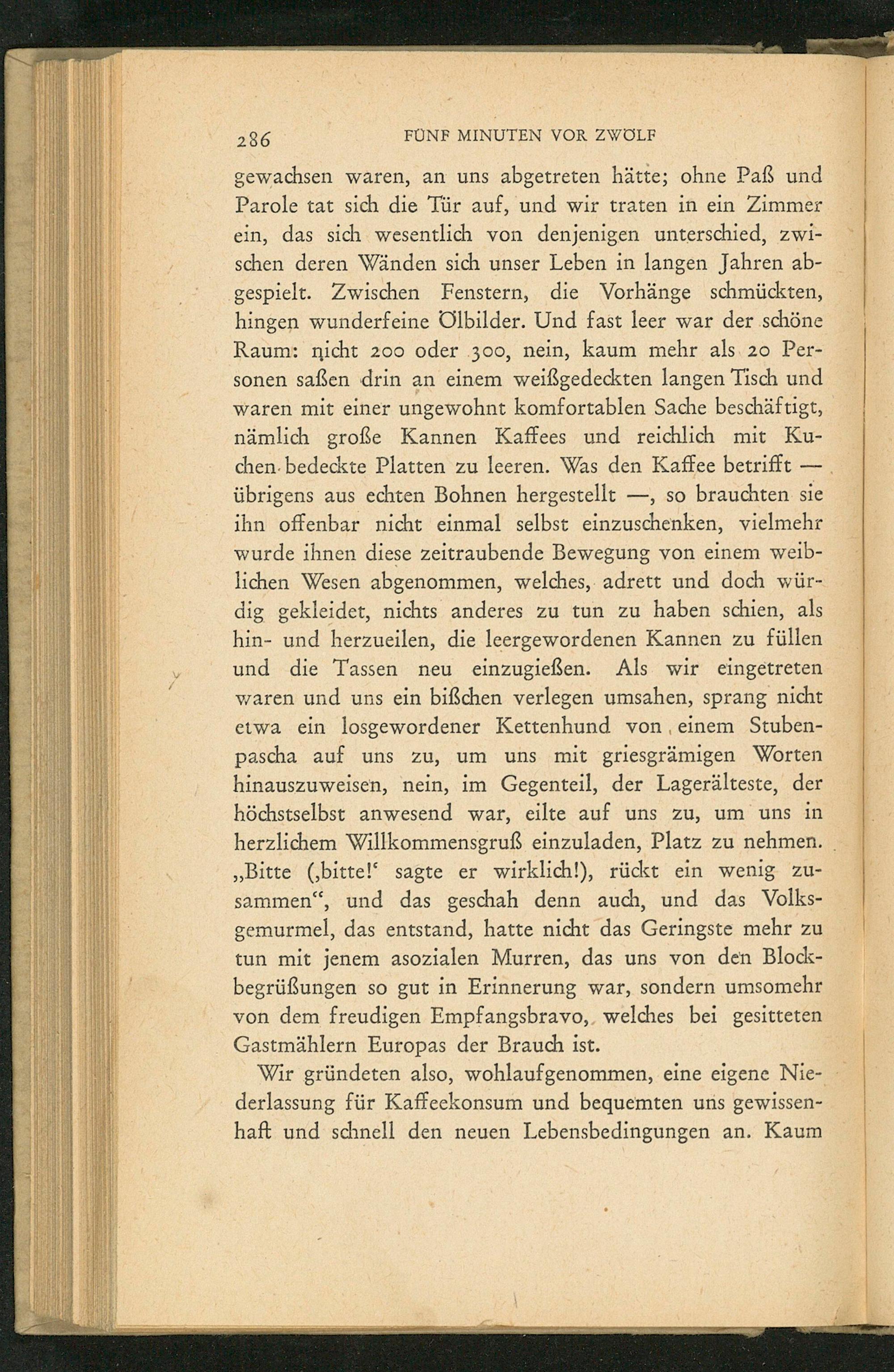 gewachsen waren, an uns abgetreten hätte; ohne Paß und Parole tat sich die Tür auf, und wir traten in ein Zimmer ein, das sich wesentlich von denjenigen unterschied, zwischen deren Wänden sich unser Leben in langen Jahren abgespielt. Zwischen Fenstern, die Vorhänge schmückten, hingen wunderfeine Ölbilder. Und fast leer war der schöne Raum: nicht 200 oder 300, nein, kaum mehr als 20 Personen saßen drin an einem weißgedeckten langen Tisch und waren mit einer ungewohnt komfortablen Sache beschäftigt, nämlich große Kannen Kaffees und reichlich mit Kuchen bedeckte Platten zu leeren. Was den Kaffee betrifft übrigens aus echten Bohnen hergestellt, so brauchten sie ihn offenbar nicht einmal selbst einzuschenken, vielmehr wurde ihnen diese zeitraubende Bewegung von einem weiblichen Wesen abgenommen, welches, adrett und doch würdig gekleidet, nichts anderes zu tun zu haben schien, als hin- und herzueilen, die leergewordenen Kannen zu füllen und die Tassen neu einzugießen. Als wir eingetreten waren und uns ein bißchen verlegen umsahen, sprang nicht etwa ein losgewordener Kettenhund von einem Stubenpascha auf uns zu, um uns mit griesgrämigen Worten hinauszuweisen, nein, im Gegenteil, der Lagerälteste, der höchstselbst anwesend war, eilte auf uns zu, um uns in herzlichem Willkommensgruß einzuladen, Platz zu nehmen. ,, Bitte(, bitte! sagte er wirklich!), rückt ein wenig zusammen", und das geschah denn auch, und das Volksgemurmel, das entstand, hatte nicht das Geringste mehr zu tun mit jenem asozialen Murren, das uns von den Blockbegrüßungen so gut in Erinnerung war, sondern umsomehr von dem freudigen Empfangsbravo, welches bei gesitteten Gastmählern Europas der Brauch ist.