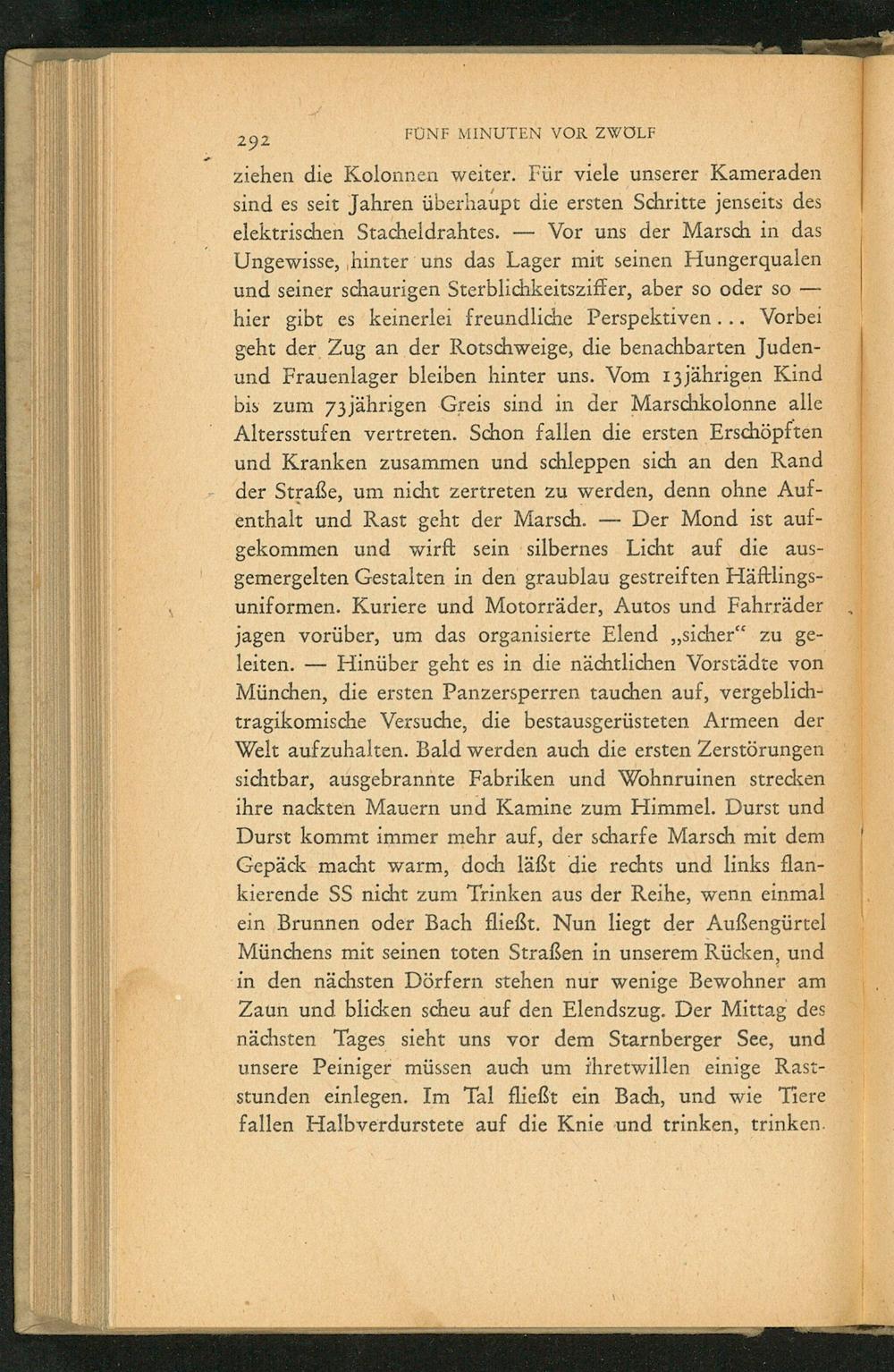 ziehen die Kolonnen weiter. Für viele unserer Kameraden sind es seit Jahren überhaupt die ersten Schritte jenseits des elektrischen Stacheldrahtes.— Vor uns der Marsch in das Ungewisse, ‚hinter uns das Lager mit seinen Hungerqualen und seiner schaurigen Sterblichkeitsziffer, aber so oder so— hier gibt es keinerlei freundliche Perspektiven... Vorbei geht der Zug an der Rotschweige, die benachbarten Juden- und Frauenlager bleiben hinter uns. Vom ı3jährigen Kind bis zum 73jährigen Greis sind in der Marschkolonne alle Altersstufen vertreten. Schon fallen die ersten Erschöpften und Kranken zusammen und schleppen sich an den Rand der Straße, um nicht zertreten zu werden, denn ohne Auf- enthalt und Rast geht der Marsch.— Der Mond ist auf- gekommen und wirft sein silbernes Licht auf die aus- gemergelten Gestalten in den graublau gestreiften Häftlings- uniformen. Kuriere und Motorräder, Autos und Fahrräder jagen vorüber, um das organisierte Elend„sicher“ zu ge- leiten.— Hinüber geht es in die nächtlichen Vorstädte von München , die ersten Panzersperren tauchen auf, vergeblich- tragikomische Versuche, die bestausgerüsteten Armeen der Welt aufzuhalten. Bald werden auch die ersten Zerstörungen sichtbar, ausgebrannte Fabriken und Wohnruinen strecken ihre nackten Mauern und Kamine zum Himmel. Durst und Durst kommt immer mehr auf, der scharfe Marsch mit dem Gepäck macht warm, doch läßt die rechts und links flan- kierende SS nicht zum Trinken aus der Reihe, wenn einmal ein Brunnen oder Bach fließt. Nun liegt der Außengürtel Münchens mit seinen toten Straßen in unserem Rücken, und in den nächsten Dörfern stehen nur wenige Bewohner am Zaun und blicken scheu auf den Elendszug. Der Mittag des nächsten Tages sieht uns vor dem Starnberger See , und unsere Peiniger müssen auch um ihretwillen einige Rast- stunden einlegen. Im Tal fließt ein Bach, und wie Tiere fallen Halbverdurstete auf die Knie und trinken, trinken.
