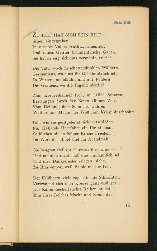 Der Feldherrn viele zogen in die Schlachten, Vertrauend sich dem Kreuze ganz und gar, Der Kaiser hocherlauchte Reihen brachten Ihm ihres Reiches Macht und Krone dar.