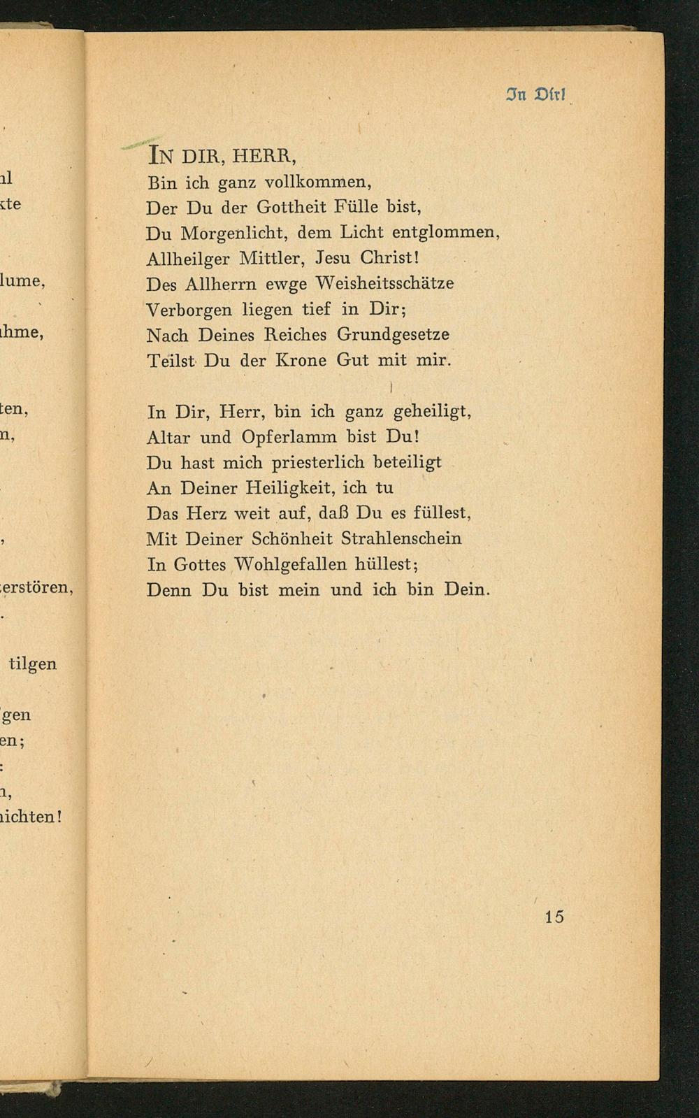 Das Herz weit auf, daß Du es füllest, Mit Deiner Schönheit Strahlenschein In Gottes Wohlgefallen hüllest;