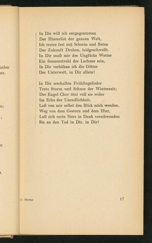 In Dir will ich entgegentreten Der Hinterlist der ganzen Welt, Ich trotze fest mit Schrein und Beten Der Zukunft Drohen, leidgeschwellt. In Dir muß mir des Unglücks Wetter Ein Sonnenstrahl des Lachens sein, In Dir verhöhne ich die Götter Der Unterwelt, in Dir allein!