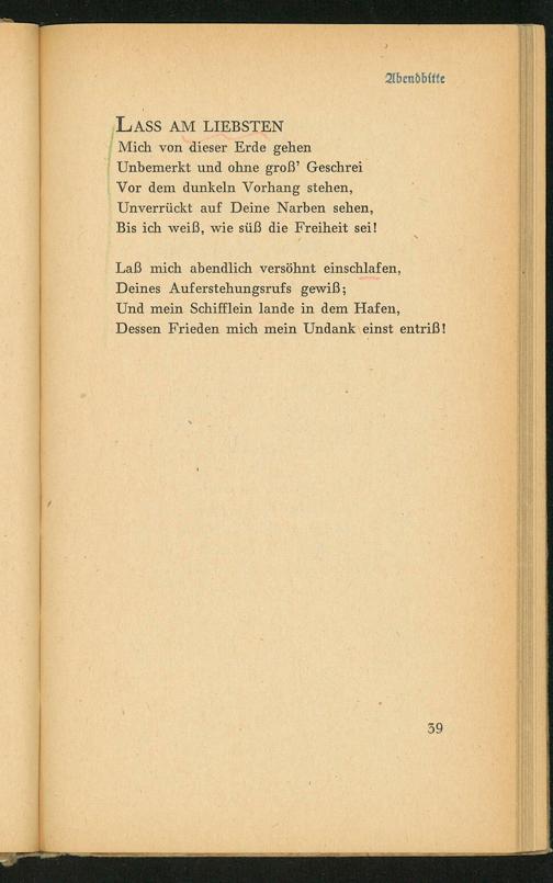 LASS AM LIEBSTEN Mich von dieser Erde gehen Unbemerkt und ohne groß' Geschrei Vor dem dunkeln Vorhang stehen, Unverrückt auf Deine Narben sehen, Bis ich weiß, wie süß die Freiheit sei!