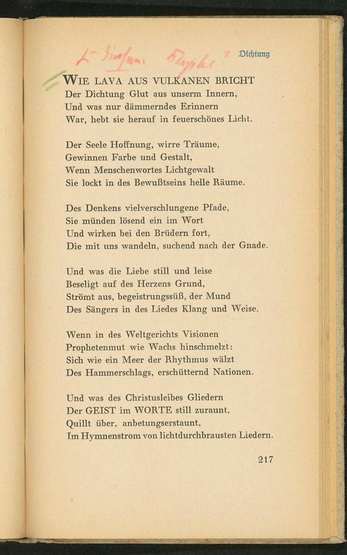 Der Dichtung Glut aus unserm Innern, Und was nur dämmerndes Erinnern War, hebt sie herauf in feuerschönes Licht.