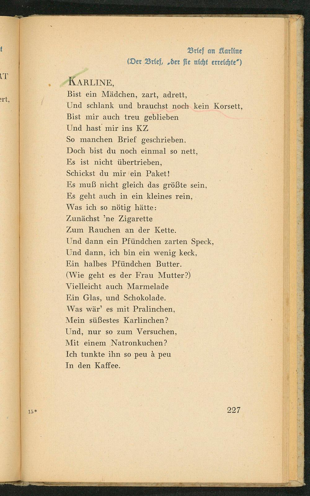 ( Wie geht es der Frau Mutter?) Vielleicht auch Marmelade Ein Glas, und Schokolade. Was wär' es mit Pralinchen, Mein süßestes Karlinchen? Und, nur so zum Versuchen, Mit einem Natronkuchen? Ich tunkte ihn so peu à