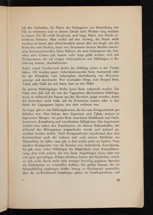 auf den Gedanken, die Haare der Gefangenen zur Herstellung von Filz zu verwerten und zu diesem Zweck sechs Wochen lang wachsen zu lassen. Die SS erhob Einspruch, weil lange Haare eine Flucht erleichtern könnten. Man verfiel auf den Ausweg, die Haare wohl wachsen zu lassen, aber allwöchentlich mitten über den Kopf, von der Stirne bis zum Nacken, einen vier Zentimeter breiten Streifen tonsurartig herauszuschneiden. Diese Büberei, die dem Gefangenen das Aussehen eines Clowns gab, konnte nicht lange geübt werden, weil sich Zivilpersonen, die auf einigen Arbeitsplätzen mit Häftlingen in Berührung kamen, skandalisierten.