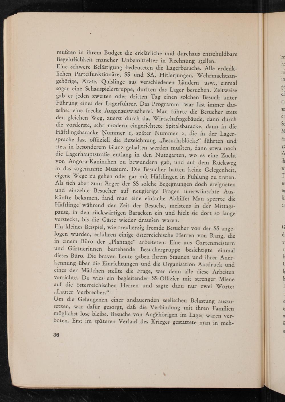 Eine schwere Belästigung bedeuteten die Lagerbesuche. Alle erdenk- lichen Parteifunktionäre, SS und SA , Hitlerjungen, Wehrmachtsan- gehörige, Ärzte, Quislinge aus verschiedenen Ländern usw., einmal sogar eine Schauspielertruppe, durften das Lager besuchen. Zeitweise gab es jeden zweiten oder dritten Tag einen solchen Besuch unter Führung eines der Lagerführer. Das Programm war fast immer das- selbe: eine freche Augenauswischerei. Man führte die Besucher stets den gleichen Weg, zuerst durch das Wirtschaftsgebäude, dann durch die vorderste, schr modern eingerichtete Spitalsbaracke, dann in die Häftlingsbaracke Nummer 1,\später Nummer 2, die in der Lager- sprache fast offiiziell die Bezeichnung„Besuchsblöcke“ führten und stets in besonderem Glanz gehalten werden mußten, dann etwa noch die Lagerhauptstraße entlang in den Nutzgarten, wo es eine Zucht von Angora-Kaninchen zu bewundern gab, und auf dem Rückweg in das sogenannte Museum. Die Besucher hatten keine Gelegenheit, eigene Wege zu gehen oder gar mit Häftlingen in Fühlung zu treten. Als sich aber zum Ärger der SS solche Begegnungen doch ereigneten und einzelne Besucher auf neugierige Fragen unerwünschte Aus- künfte bekamen, fand man eine einfache Abhilfe: Man sperrte die Häftlinge während der Zeit der Besuche, meistens in der Mittags- pause, in den rückwärtigen Baracken ein und hielt sie dort so lange versteckt, bis die Gäste wieder draußen waren.