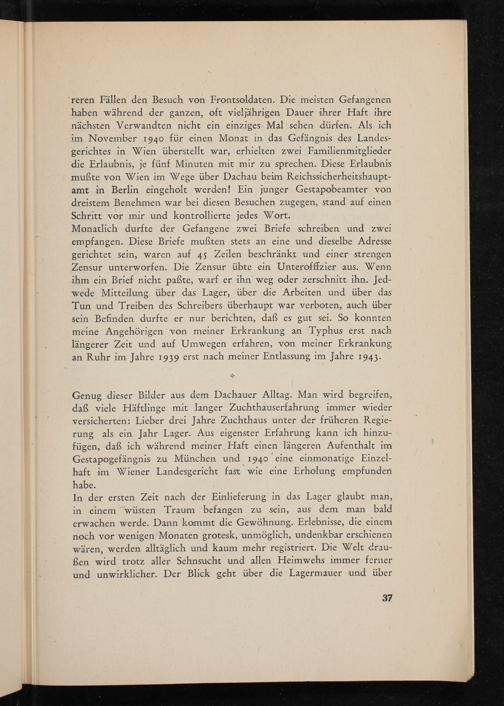 Genug dieser Bilder aus dem Dachauer Alltag. Man wird begreifen, daß viele Häftlinge mit langer Zuchthauserfahrung immer wieder versicherten: Lieber drei Jahre Zuchthaus unter der früheren Regierung als ein Jahr Lager. Aus eigenster Erfahrung kann ich hinzufügen, daß ich während meiner Haft einen längeren Aufenthalt im Gestapogefängnis zu München und 1940 eine einmonatige Einzelhaft im Wiener Landesgericht fast wie eine Erholung empfunden habe.
