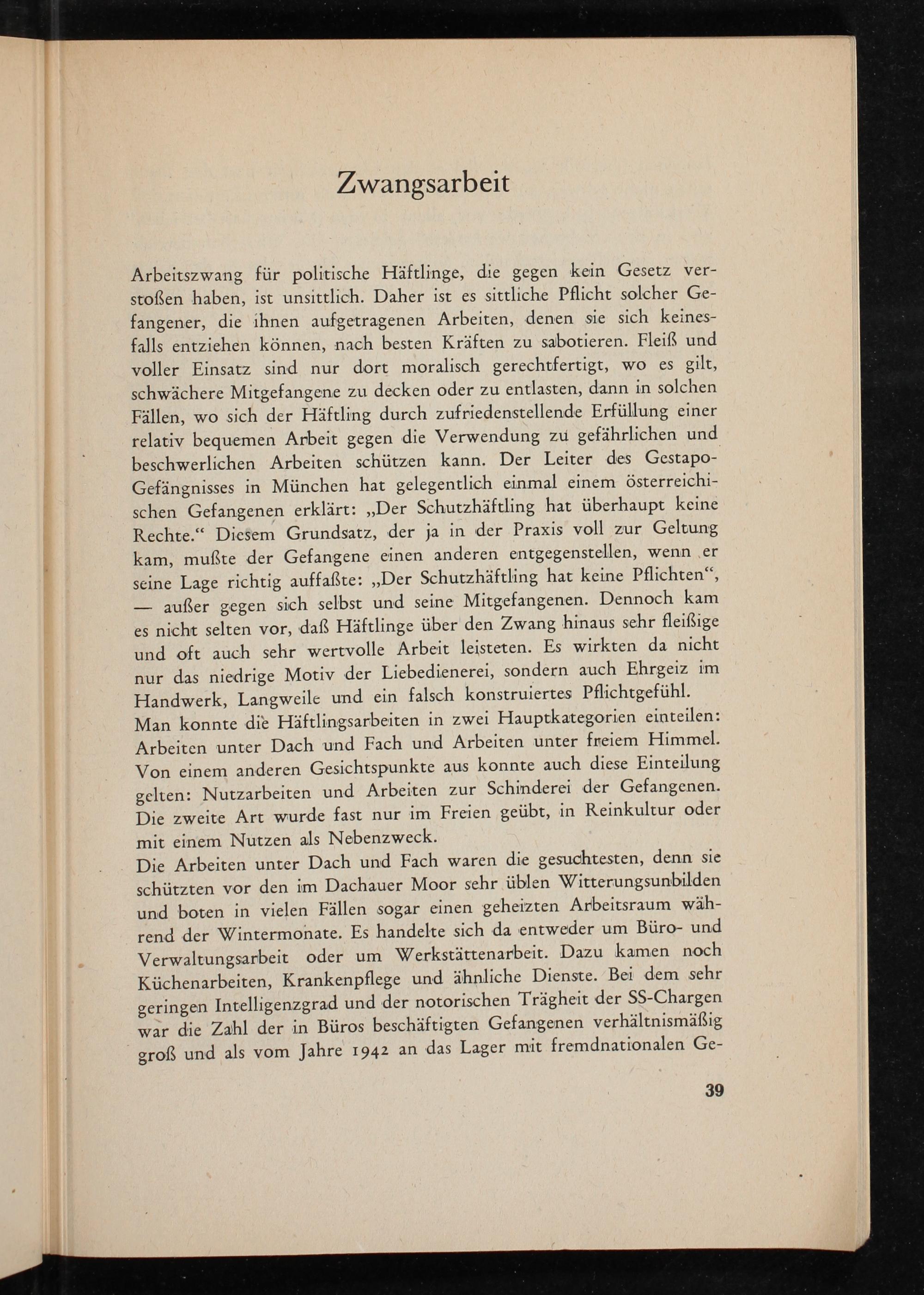 Arbeitszwang für politische Häftlinge, die gegen kein Gesetz verstoßen haben, ist unsittlich. Daher ist es sittliche Pflicht solcher Gefangener, die ihnen aufgetragenen Arbeiten, denen sie sich keinesfalls entziehen können, nach besten Kräften zu sabotieren. Fleiß und voller Einsatz sind nur dort moralisch gerechtfertigt, wo es gilt, schwächere Mitgefangene zu decken oder zu entlasten, dann in solchen Fällen, wo sich der Häftling durch zufriedenstellende Erfüllung einer relativ bequemen Arbeit gegen die Verwendung zu gefährlichen und beschwerlichen Arbeiten schützen kann. Der Leiter des GestapoGefängnisses in München hat gelegentlich einmal einem österreichischen Gefangenen erklärt:„ Der Schutzhäftling hat überhaupt keine Rechte." Diesem Grundsatz, der ja in der Praxis voll zur Geltung kam, mußte der Gefangene einen anderen entgegenstellen, wenn er seine Lage richtig auffaßte:„ Der Schutzhäftling hat keine Pflichten",