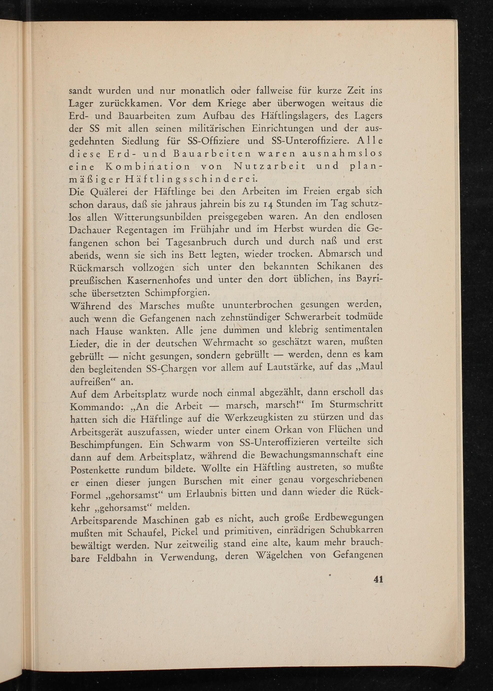 Während des Marsches mußte ununterbrochen gesungen werden, auch wenn die Gefangenen nach zehnstündiger Schwerarbeit todmüde nach Hause wankten. Alle jene dummen und klebrig sentimentalen Lieder, die in der deutschen Wehrmacht so geschätzt waren, mußten gebrüllt nicht gesungen, sondern gebrüllt werden, denn es kam den begleitenden SS- Chargen vor allem auf Lautstärke, auf das ,, Maul aufreißen" an.