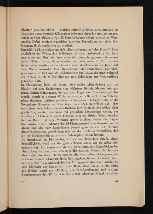 Ungezählte Male ereigneten sich ,, Erschießungen auf der Flucht". Dies geschah in der Weise, daß Häftlinge auf ihrem Arbeitsplatz den Auftrag erhielten, über die Sperrkette der Bewachungsposten hinauszugehen. Taten sie es, dann wurden sie niedergeknallt. Auf meinem Arbeitsplatz wurden einmal binnen sechs Wochen etwa 42 Juden auf diese Weise ermordet. Das Überschreiten der Postenkette war übrigens auch eine Methode des Selbstmordes für Leute, die man während der Arbeit durch Mißhandlungen und Schikanen zur Verzweiflung getrieben hatte.