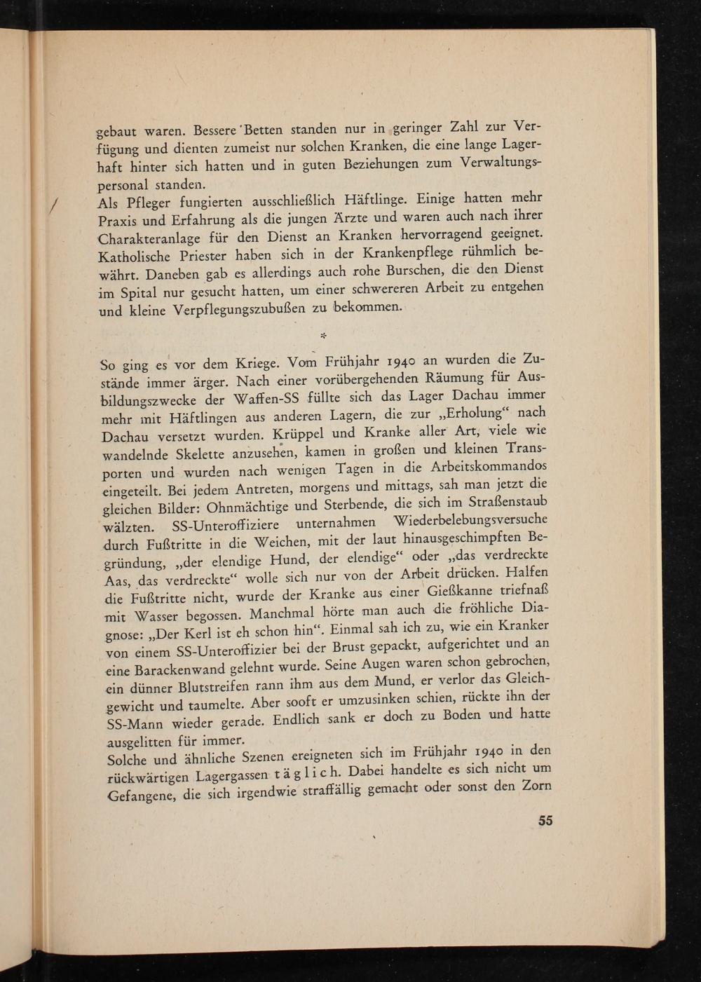 So ging es vor dem Kriege. Vom Frühjahr 1940 an wurden die Zustände immer ärger. Nach einer vorübergehenden Räumung für Ausbildungszwecke der Waffen- SS füllte sich das Lager Dachau immer mehr mit Häftlingen aus anderen Lagern, die zur„, Erholung" nach Dachau versetzt wurden. Krüppel und Kranke aller Art, viele wie wandelnde Skelette anzusehen, kamen in großen und kleinen Transporten und wurden nach wenigen Tagen in die Arbeitskommandos eingeteilt. Bei jedem Antreten, morgens und mittags, sah man jetzt die gleichen Bilder: Ohnmächtige und Sterbende, die sich im Straßenstaub wälzten. SS - Unteroffiziere unternahmen Wiederbelebungsversuche durch Fußtritte in die Weichen, mit der laut hinausgeschimpften Begründung ,,, der elendige Hund, der elendige" oder„, das verdreckte Aas, das verdreckte" wolle sich nur von der Arbeit drücken. Halfen die Fußtritte nicht, wurde der Kranke aus einer Gießkanne triefnaẞ mit Wasser begossen. Manchmal hörte man auch die fröhliche Diagnose: ,, Der Kerl ist eh schon hin". Einmal sah ich zu, wie ein Kranker von einem SS - Unteroffizier bei der Brust gepackt, aufgerichtet und an eine Barackenwand gelehnt wurde. Seine Augen waren schon gebrochen, ein dünner Blutstreifen rann ihm aus dem Mund, er verlor das Gleichgewicht und taumelte. Aber sooft er umzusinken schien, rückte ihn der SS- Mann wieder gerade. Endlich sank er doch zu Boden und hatte ausgelitten für immer.