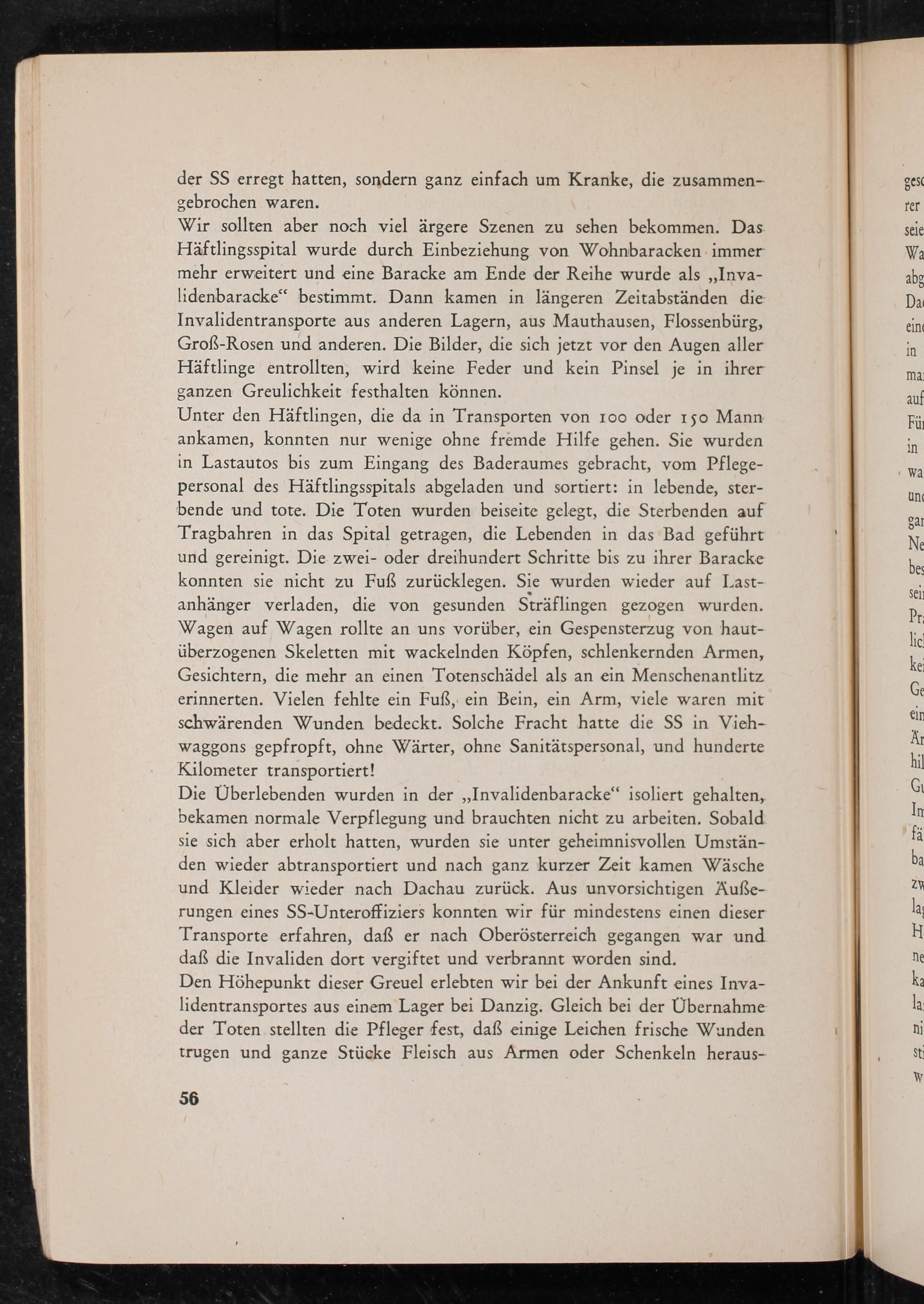 Die Überlebenden wurden in der„Invalidenbaracke“ isoliert gehalten, bekamen normale Verpflegung und brauchten nicht zu arbeiten. Sobald sie sich aber erholt hatten, wurden sie unter geheimnisvollen Umstän- den wieder abtransportiert und nach ganz kurzer Zeit kamen Wäsche und Kleider wieder nach Dachau zurück. Aus unvorsichtigen Äuße- rungen eines SS-Unteroffiziers konnten wir für mindestens einen dieser Transporte erfahren, daß er nach Oberösterreich gegangen war und daß die Invaliden dort vergiftet und verbrannt worden sind.