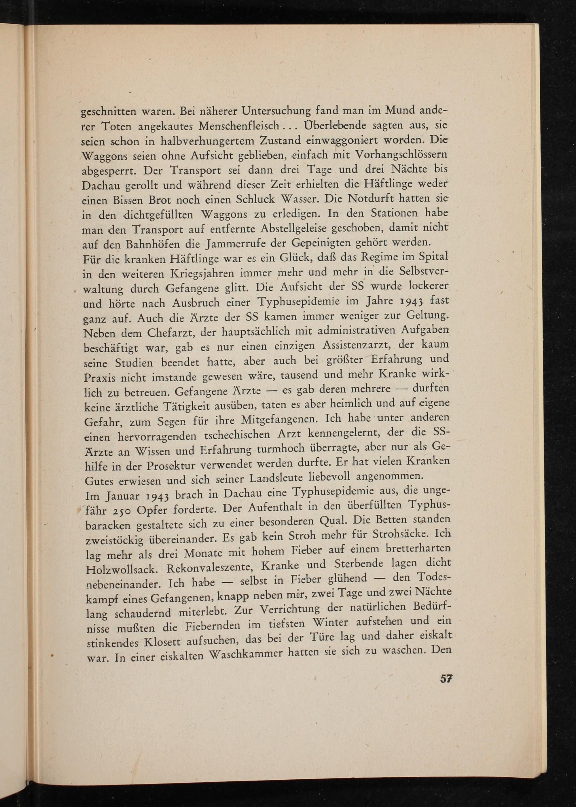 Im Januar 1943 brach in Dachau eine Typhusepidemie aus, die unge- fähr 250 Opfer forderte. Der Aufenthalt in den überfüllten Typhus- baracken gestaltete sich zu einer besonderen Qual. Die Betten standen zweistöckig übereinander. Es gab kein Stroh mehr für Strohsäcke. Ich lag mehr als drei Monate mit hohem Fieber auf einem bretterharten Holzwollsack. Rekonvaleszente, Kranke und Sterbende lagen dicht nebeneinander. Ich habe— selbst in Fieber glühend— den Todes- kampf eines Gefangenen, knapp neben mir, zwei Tage und zwei Nächte lang schaudernd miterlebt. Zur Verrichtung der natürlichen Bedürf- nisse mußten die Fiebernden im tiefsten Winter aufstehen und ein stinkendes Klosett aufsuchen, das bei der Türe lag und daher eiskalt war. In einer eiskalten Waschkammer hatten sie sich zu waschen. Den