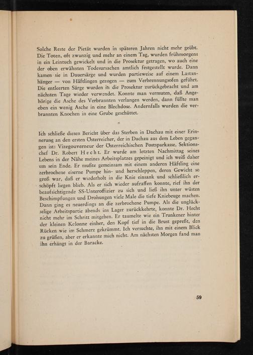 Ich schließe diesen Bericht über das Sterben in Dachau mit einer Erinnerung an den ersten Österreicher, der in Dachau aus dem Leben gegangen ist: Vizegouverneur der Österreichischen Postsparkasse, Sektionschef Dr. Robert Hecht. Er wurde am letzten Nachmittag seines Lebens in der Nähe meines Arbeitsplatzes gepeinigt und ich weiß daher um sein Ende. Er mußte gemeinsam mit einem anderen Häftling cine zerbrochene eiserne Pumpe hin- und herschleppen, deren Gewicht so groß war, daß er wiederholt in die Knie einsank und schließlich erschöpft liegen blieb. Als er sich wieder aufraffen konnte, rief ihn der beaufsichtigende SS - Unteroffizier zu sich und ließ ihn unter wüsten Beschimpfungen und Drohungen viele Male die tiefe Kniebeuge machen. Dann ging es neuerdings an die zerbrochene Pumpe. Als die unglückselige Arbeitspartie abends ins Lager zurückkehrte, konnte Dr. Hecht nicht mehr im Schritt mitgehen. Er taumelte wie ein Trunkener hinter der kleinen Kclonne einher, den Kopf tief in die Brust gepreẞt, den Rücken wie im Schmerz gekrümmt. Ich versuchte, ihn mit einem Blick zu grüßen, aber er erkannte mich nicht. Am nächsten Morgen fand man ihn erhängt in der Baracke.