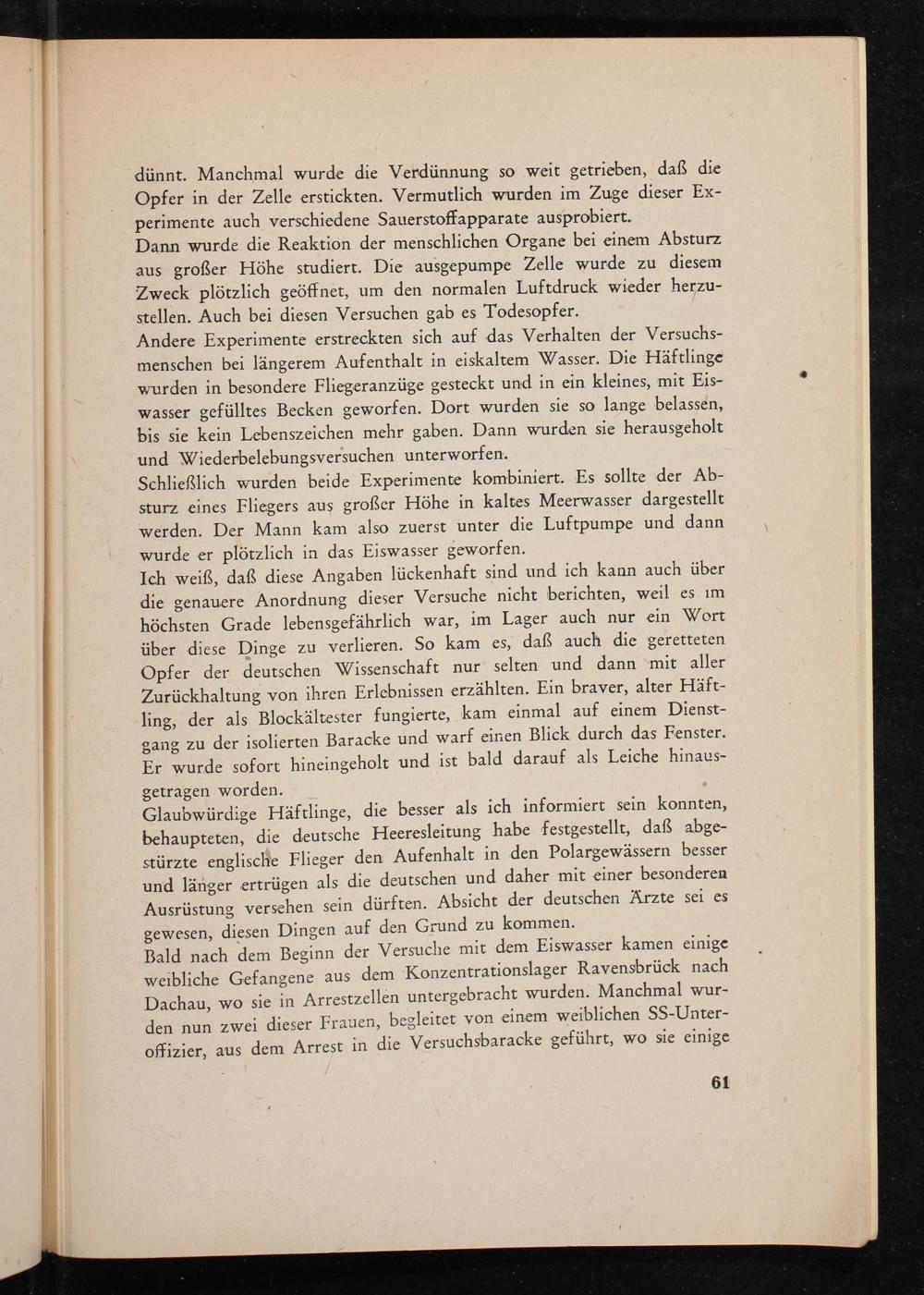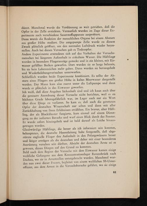 Glaubwürdige Häftlinge, die besser als ich informiert sein konnten, behaupteten, die deutsche Heeresleitung habe festgestellt, daß abgestürzte englische Flieger den Aufenhalt in den Polargewässern besser und länger ertrügen als die deutschen und daher mit einer besonderen Ausrüstung versehen sein dürften. Absicht der deutschen Ärzte sei es gewesen, diesen Dingen auf den Grund zu kommen.