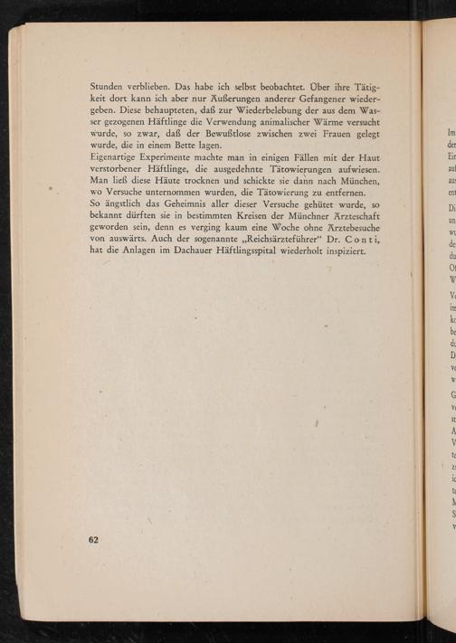 Stunden verblieben. Das habe ich selbst beobachtet. Über ihre Tätig- keit dort kann ich aber nur Äußerungen anderer Gefangener wieder- geben. Diese behaupteten, daß zur Wiederbelebung der aus dem Was- ser gezogenen Häftlinge die Verwendung animalischer Wärme versucht wurde, so zwar, daß der Bewußtlose zwischen zwei Frauen gelegt wurde, die in einem Bette lagen.