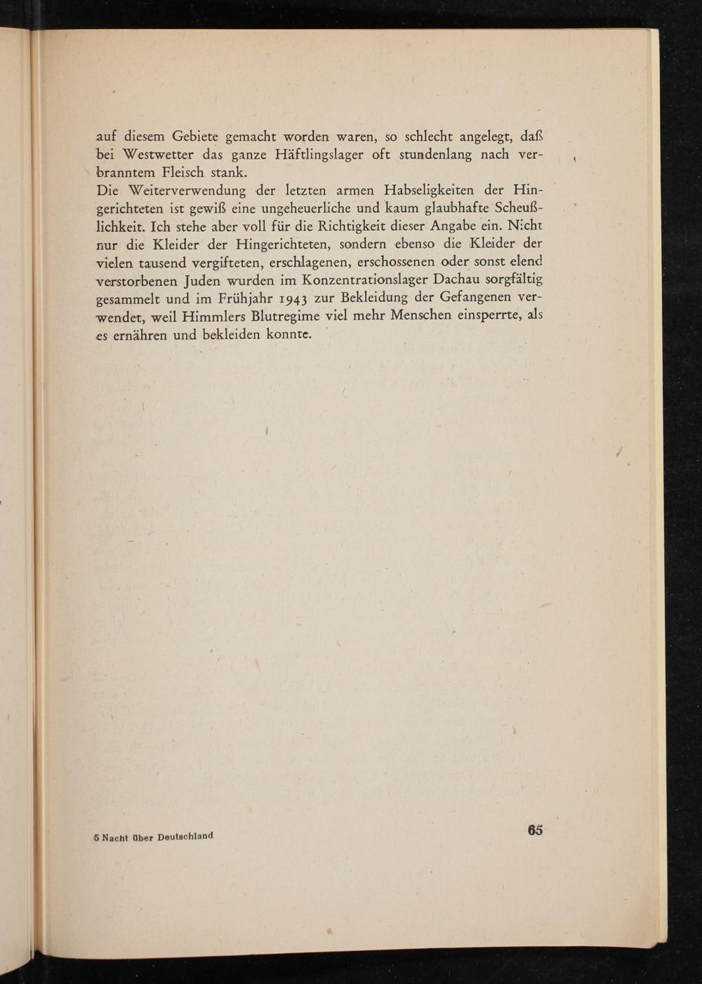 Die Weiterverwendung der letzten armen Habseligkeiten der Hin- gerichteten ist gewiß eine ungeheuerliche und kaum glaubhafte Scheuß- lichkeit. Ich stehe aber voll für die Richtigkeit dieser Angabe ein. Nicht nur die Kleider der Hingerichteten, sondern ebenso die Kleider der vielen tausend vergifteten, erschlagenen, erschossenen oder sonst elend verstorbenen Juden wurden im Konzentrationslager Dachau sorgfältig gesammelt und im Frühjahr 1943 zur Bekleidung der Gefangenen ver- ‚wendet, weil Himmlers Blutregime viel mehr Menschen einsperrte, als es ernähren und bekleiden konnte.