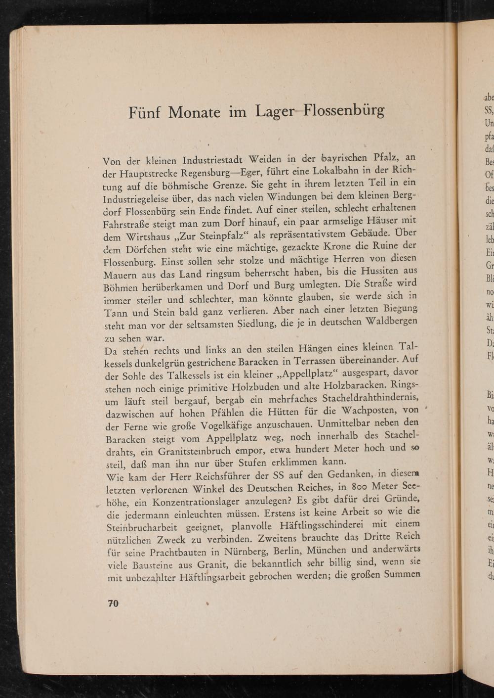 Wie kam der Herr Reichsführer der SS auf den Gedanken, in diesera letzten verlorenen Winkel des Deutschen Reiches, in 800 Meter See- höhe, ein Konzentrationslager anzulegen? Es gibt dafür drei Gründe, die jedermann einleuchten müssen. Erstens ist keine Arbeit so wie die Steinbrucharbeit geeignet, planvolle Häftlingsschinderei mit einem nützlichen Zweck zu verbinden. Zweitens brauchte das Dritte Reich für seine Prachtbauten in Nürnberg, Berlin, München und anderwärts viele Bausteine aus Granit, die bekanntlich sehr billig sind, wenn sie mit unbezahlter Häftlingsarbeit gebrochen werden; die großen Summen