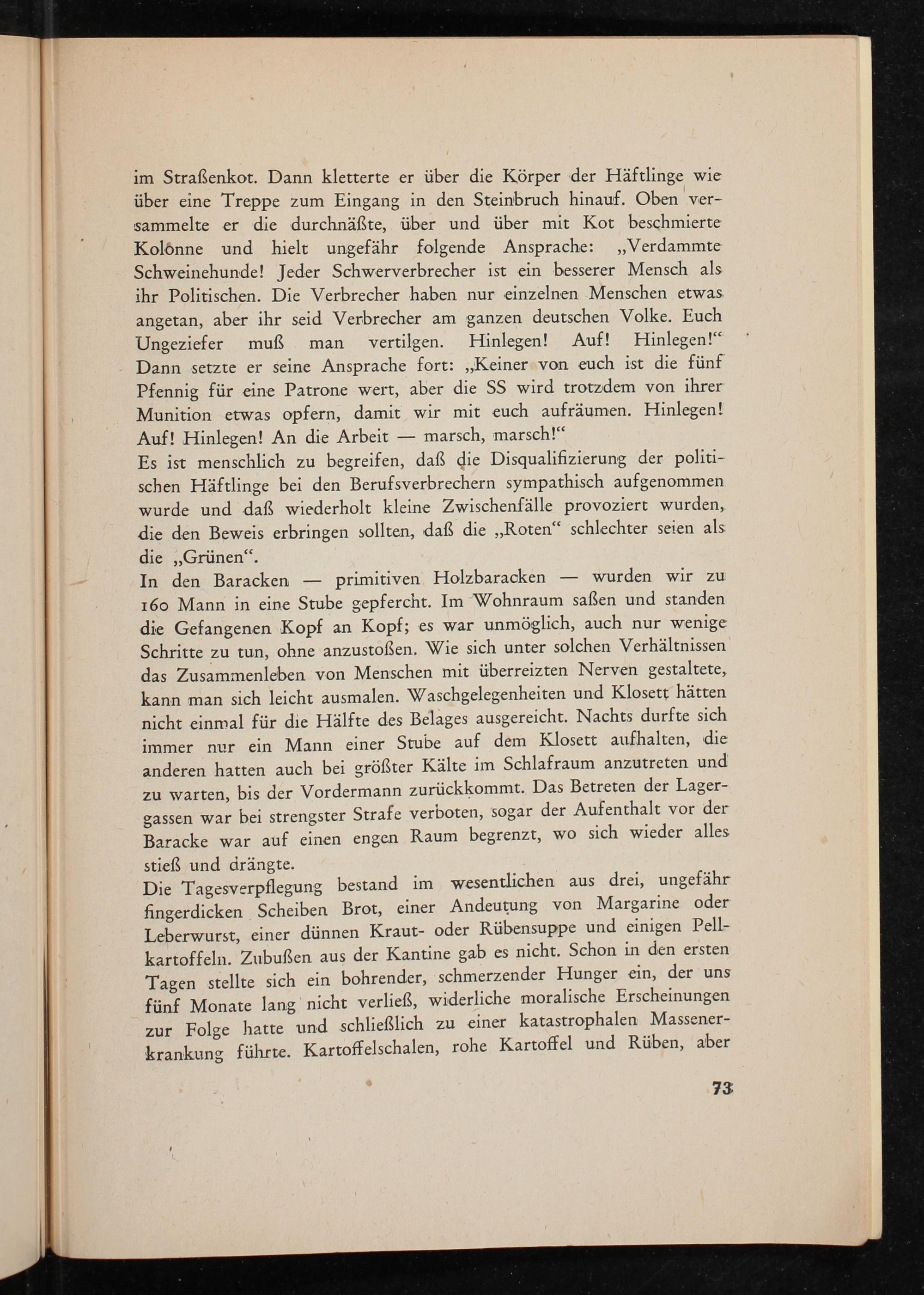 im Straßenkot. Dann kletterte er über die Körper der Häftlinge wie über eine Treppe zum Eingang in den Steinbruch hinauf. Oben versammelte er die durchnäßte, über und über mit Kot beschmierte Kolonne und hielt ungefähr folgende Ansprache:„ Verdammte Schweinehunde! Jeder Schwerverbrecher ist ein besserer Mensch als ihr Politischen . Die Verbrecher haben nur einzelnen Menschen etwas angetan, aber ihr seid Verbrecher am ganzen deutschen Volke. Euch Ungeziefer muß man vertilgen. Hinlegen! Auf! Hinlegen!" Dann setzte er seine Ansprache fort: ,, Keiner von euch ist die fünf Pfennig für eine Patrone wert, aber die SS wird trotzdem von ihrer Munition etwas opfern, damit wir mit euch aufräumen. Hinlegen! Auf! Hinlegen! An die Arbeit marsch, marsch!"