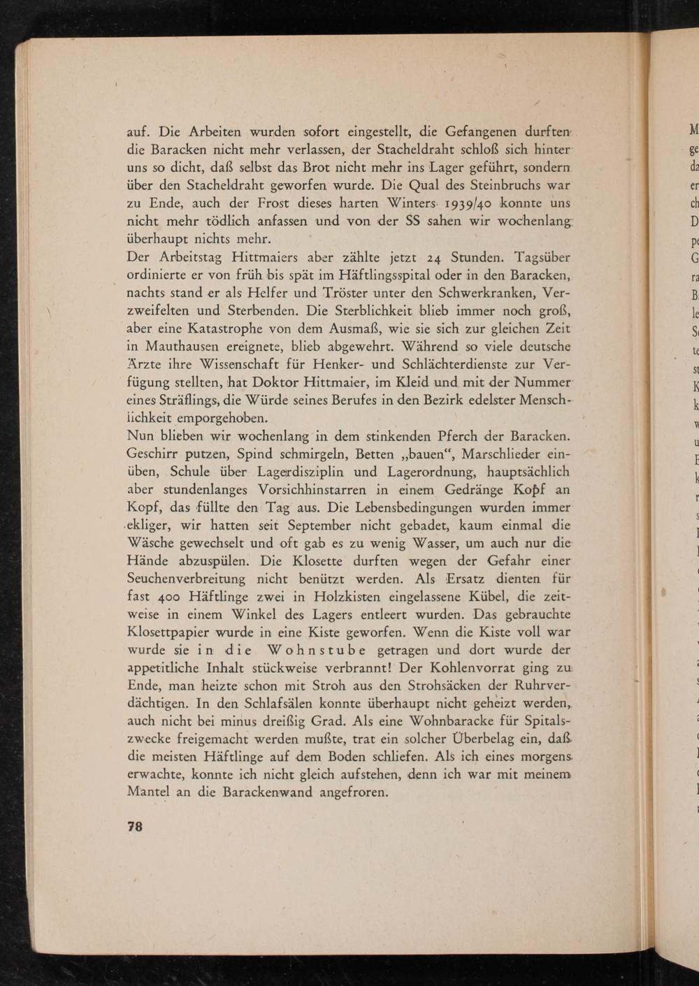 auf. Die Arbeiten wurden sofort eingestellt, die Gefangenen durften: die Baracken nicht mehr verlassen, der Stacheldraht schloß sich hinter uns so dicht, daß selbst das Brot nicht mehr ins Lager geführt, sondern über den Stacheldraht geworfen wurde. Die Qual des Steinbruchs war zu Ende, auch der Frost dieses harten Winters: 1939/40 konnte uns nicht mehr tödlich anfassen und von der SS sahen wir wochenlang überhaupt nichts mehr.