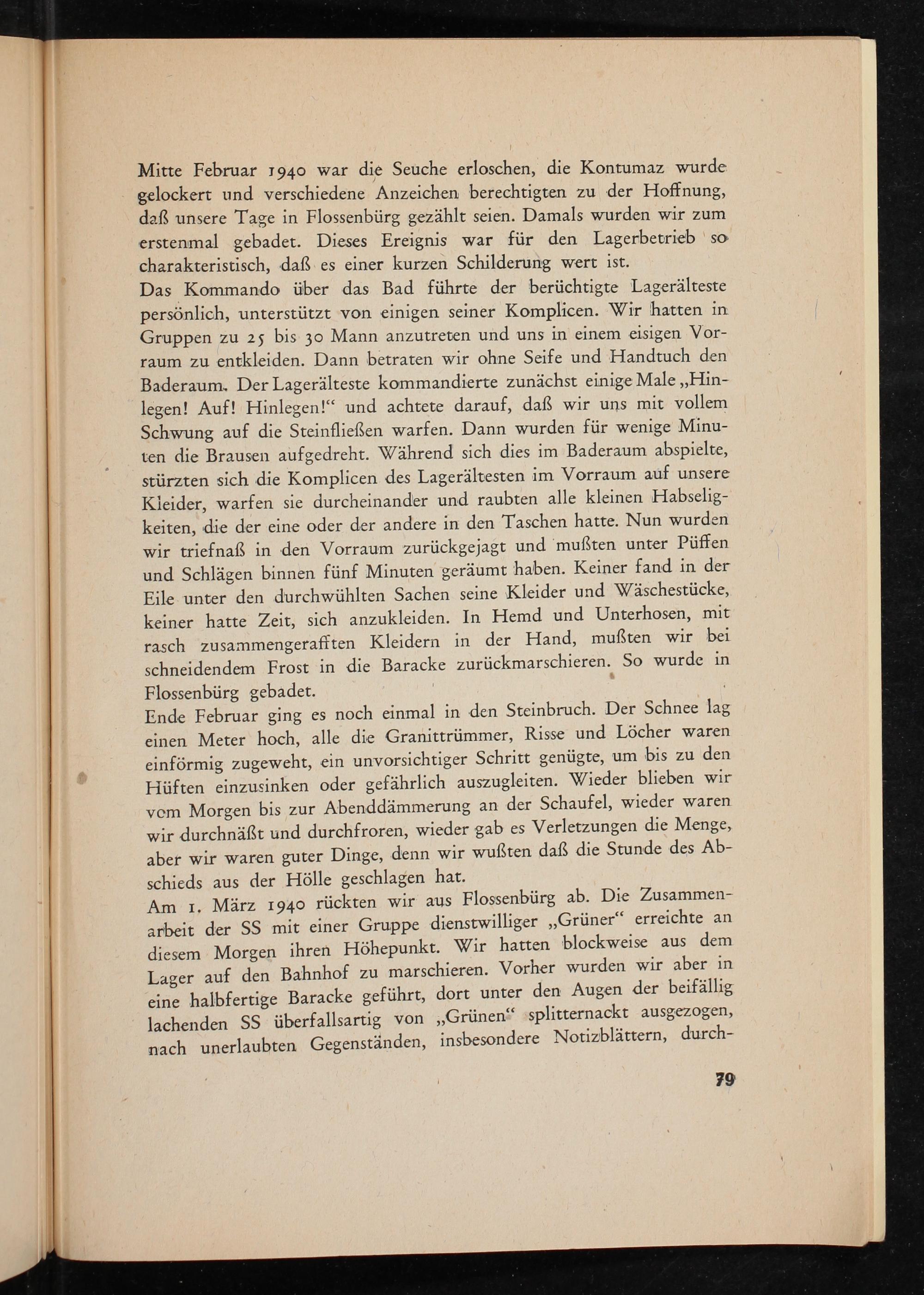 Mitte Februar 1940 war die Seuche erloschen, die Kontumaz wurde gelockert und verschiedene Anzeichen berechtigten zu der Hoffnung, daß unsere Tage in Flossenbürg gezählt seien. Damals wurden wir zum erstenmal gebadet. Dieses Ereignis war für den Lagerbetrieb so charakteristisch, daß es einer kurzen Schilderung wert ist.