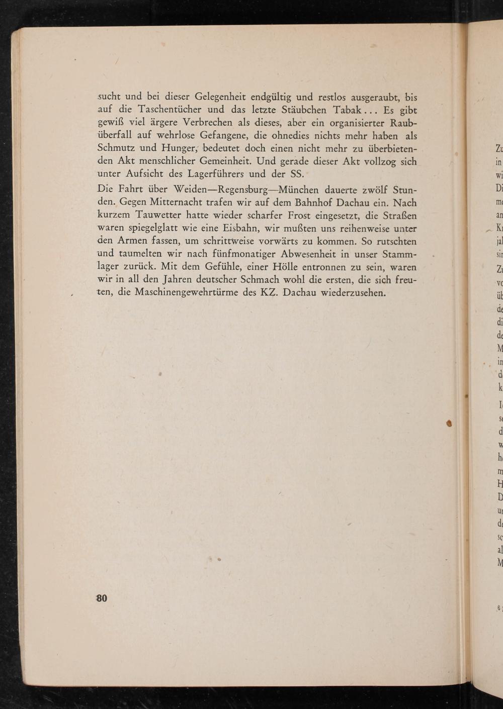 Die Fahrt über Weiden—Regensburg— München dauerte zwölf Stun- den. Gegen Mitternacht trafen wir auf dem Bahnhof Dachau ein. Nach kurzem Tauwetter hatte wieder scharfer Frost eingesetzt, die Straßen waren spiegelglatt wie eine Eisbahn, wir mußten uns reihenweise unter den Armen fassen, um schrittweise vorwärts zu kommen. So rutschten und taumelten wir nach fünfmonatiger Abwesenheit in unser Stamm- lager zurück. Mit dem Gefühle, einer Hölle entronnen zu sein, waren wir in all den Jahren deutscher Schmach wohl die ersten, die sich freu- ten, die Maschinengewehrtürme des KZ. Dachau wiederzusehen.