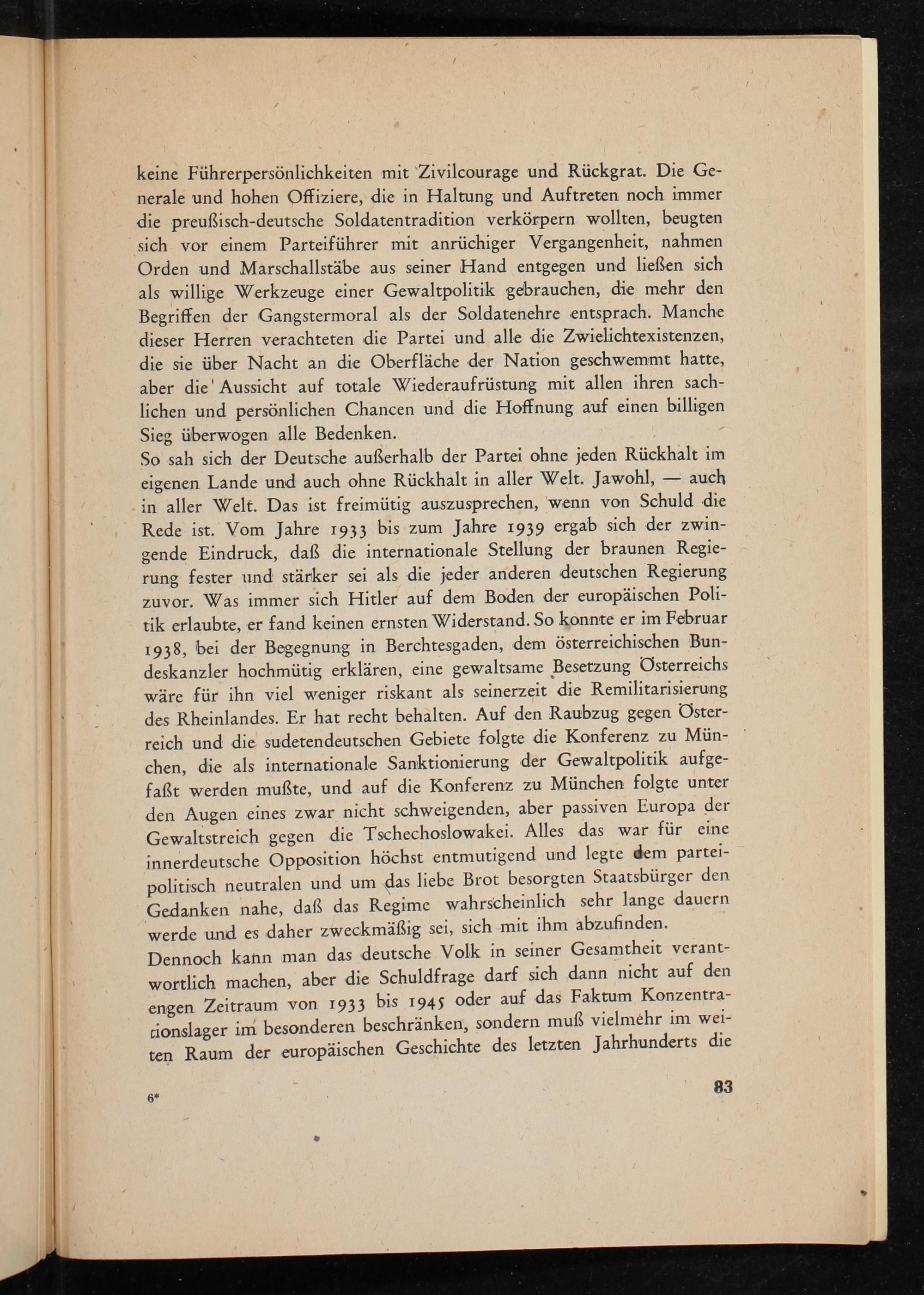 So sah sich der Deutsche außerhalb der Partei ohne jeden Rückhalt im auch eigenen Lande und auch ohne Rückhalt in aller Welt. Jawohl, in aller Welt. Das ist freimütig auszusprechen, wenn von Schuld die Rede ist. Vom Jahre 1933 bis zum Jahre 1939 ergab sich der zwingende Eindruck, daß die internationale Stellung der braunen Regierung fester und stärker sei als die jeder anderen deutschen Regierung zuvor. Was immer sich Hitler auf dem Boden der europäischen Politik erlaubte, er fand keinen ernsten Widerstand. So konnte er im Februar 1938, bei der Begegnung in Berchtesgaden , dem österreichischen Bundeskanzler hochmütig erklären, eine gewaltsame Besetzung Österreichs wäre für ihn viel weniger riskant als seinerzeit die Remilitarisierung des Rheinlandes. Er hat recht behalten. Auf den Raubzug gegen Österreich und die sudetendeutschen Gebiete folgte die Konferenz zu München , die als internationale Sanktionierung der Gewaltpolitik aufgefaßt werden mußte, und auf die Konferenz zu München folgte unter den Augen eines zwar nicht schweigenden, aber passiven Europa der Gewaltstreich gegen die Tschechoslowakei . Alles das war für eine innerdeutsche Opposition höchst entmutigend und legte dem parteipolitisch neutralen und um das liebe Brot besorgten Staatsbürger den Gedanken nahe, daß das Regime wahrscheinlich sehr lange dauern werde und es daher zweckmäßig sei, sich mit ihm abzufinden. Dennoch kann man das deutsche Volk in seiner Gesamtheit verantwortlich machen, aber die Schuldfrage darf sich dann nicht auf den engen Zeitraum von 1933 bis 1945 oder auf das Faktum Konzentrationslager im besonderen beschränken, sondern muß vielmehr im weiten Raum der europäischen Geschichte des letzten Jahrhunderts die