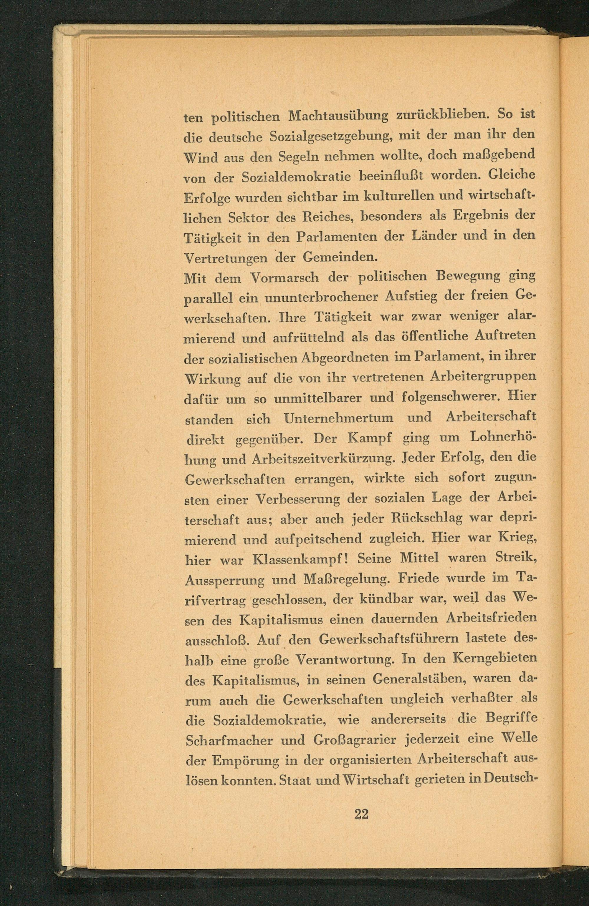 Mit dem Vormarsch der politischen Bewegung ging parallel ein ununterbrochener Aufstieg der freien Gewerkschaften. Ihre Tätigkeit war zwar weniger alarmierend und aufrüttelnd als das öffentliche Auftreten der sozialistischen Abgeordneten im Parlament, in ihrer Wirkung auf die von ihr vertretenen Arbeitergruppen dafür um so unmittelbarer und folgenschwerer. Hier standen sich Unternehmertum und Arbeiterschaft direkt gegenüber. Der Kampf ging um Lohnerhöhung und Arbeitszeitverkürzung. Jeder Erfolg, den die Gewerkschaften errangen, wirkte sich sofort zugunsten einer Verbesserung der sozialen Lage der Arbeiterschaft aus; aber auch jeder Rückschlag war deprimierend und aufpeitschend zugleich. Hier war Krieg, hier war Klassenkampf! Seine Mittel waren Streik, Aussperrung und Maßregelung. Friede wurde im Tarifvertrag geschlossen, der kündbar war, weil das Wesen des Kapitalismus einen dauernden Arbeitsfrieden ausschloß. Auf den Gewerkschaftsführern lastete deshalb eine große Verantwortung. In den Kerngebieten des Kapitalismus, in seinen Generalstäben, waren darum auch die Gewerkschaften ungleich verhaẞter als die Sozialdemokratie, wie andererseits die Begriffe Scharfmacher und Großagrarier jederzeit eine Welle der Empörung in der organisierten Arbeiterschaft auslösen konnten. Staat und Wirtschaft gerieten in Deutsch