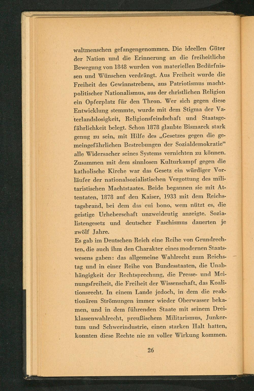 waltmenschen gefangengenommen. Die ideellen Güter der Nation und die Erinnerung an die freiheitliche Bewegung von 1848 wurden von materiellen Bedürfnissen und Wünschen verdrängt. Aus Freiheit wurde die Freiheit des Gewinnstrebens, aus Patriotismus machtpolitischer Nationalismus, aus der christlichen Religion ein Opferplatz für den Thron. Wer sich gegen diese Entwicklung stemmte, wurde mit dem Stigma der Vaterlandslosigkeit, Religionsfeindschaft und Staatsgefährlichkeit belegt. Schon 1878 glaubte Bismarck stark genug zu sein, mit Hilfe des„ Gesetzes gegen die gemeingefährlichen Bestrebungen der Sozialdemokratie" alle Widersacher seines Systems vernichten zu können. Zusammen mit dem sinnlosen Kulturkampf gegen die katholische Kirche war das Gesetz ein würdiger Vorläufer der nationalsozialistischen Vergottung des militaristischen Machtstaates. Beide begannen sie mit Attentaten, 1878 auf den Kaiser, 1933 mit dem Reichstagsbrand, bei dem das cui bono, wem nützt es, die geistige Urheberschaft unzweideutig anzeigte. Sozialistengesetz und deutscher Faschismus dauerten je zwölf Jahre.