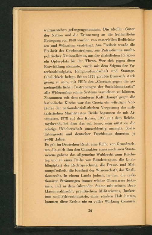 Es gab im Deutschen Reich eine Reihe von Grundrechten, die auch ihm den Charakter eines modernen Staatswesens gaben: das allgemeine Wahlrecht zum Reichstag und in einer Reihe von Bundesstaaten, die Unabhängigkeit der Rechtsprechung, die Presse- und Meinungsfreiheit, die Freiheit der Wissenschaft , das Koalitionsrecht. In einem Lande jedoch, in dem die reaktionären Strömungen immer wieder Oberwasser bekamen, und in dem führenden Staate mit seinem Dreiklassenwahlrecht, preußischem Militarismus, Junkertum und Schwerindustrie, einen starken Halt hatten, konnten diese Rechte nie zu voller Wirkung kommen.